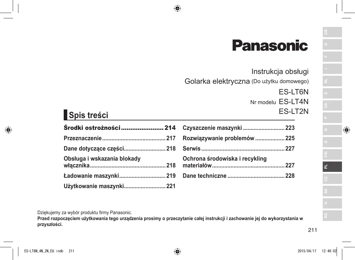 Instrukcja obsługi Dziękujemy za wybór produktu firmy Panasonic. Przed rozpoczęciem użytkowania tego urządzenia prosimy o przeczytanie całej instrukcji i zachowanie jej do wykorzystania w przyszłości. ES-LT6N_4N_2N_EU.indb