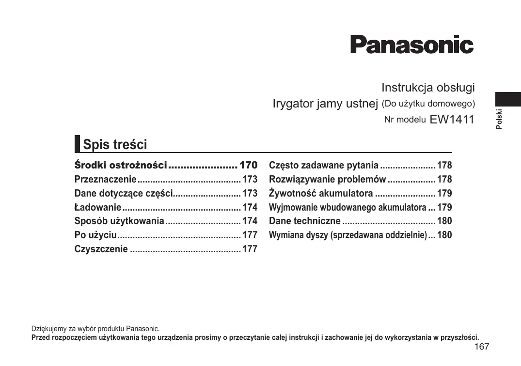 Pobierz instrukcję dla swojego Irygator jamy ustnej w formacie PDF za darmo! Znajdź swoją instrukcję EW1411 - PANASONIC i weź swoje urządzenie elektroniczne z powrotem w ręce. Na tej stronie opublikowane są wszystkie dokumenty niezbędne do korzystania z urządzenia. EW1411 marki PANASONIC.