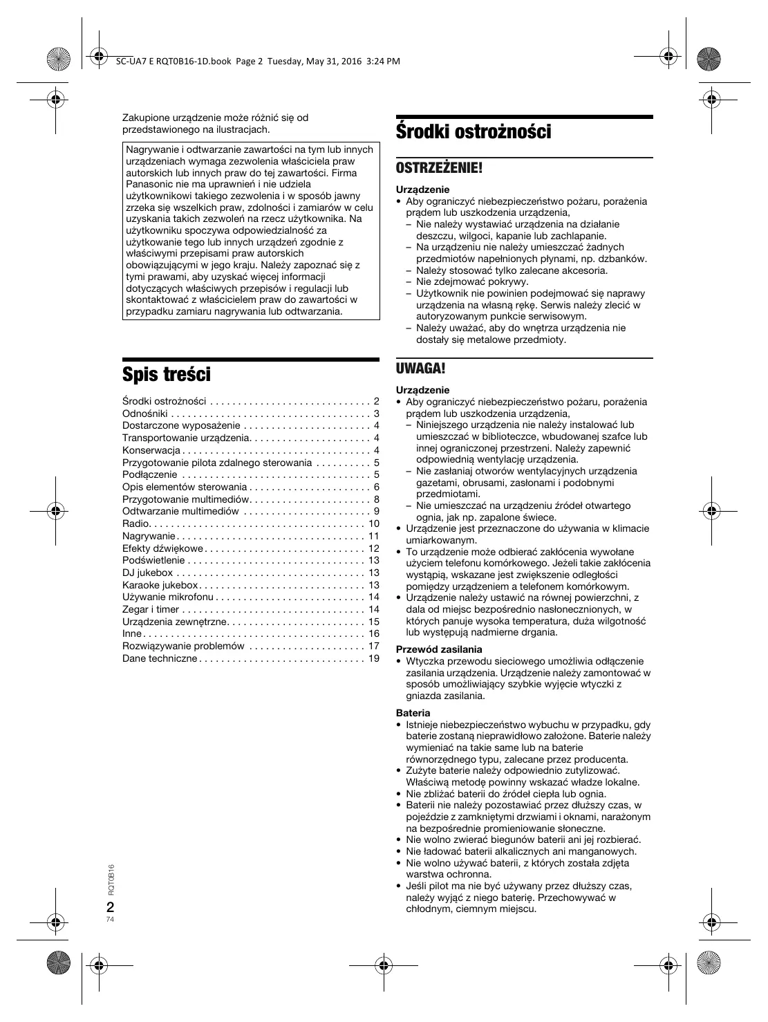 - SC-UA7 E RQT0B16-1D.book Page 2 Tuesday, May 31, 2016 3:24 PM Zakupione urządzenie może różnić się od przedstawionego na ilustracjach. Nagrywanie i odtwarzanie zawartości na tym lub innych urządzeniach wymaga zezwolenia właściciela praw autorskich lub innych praw do tej zawartości. Firma Panasonic nie ma uprawnień i nie udziela użytkownikowi takiego zezwolenia i w sposób jawny zrzeka się wszelkich praw, zdolności i zamiarów w celu uzyskania takich zezwoleń na rzecz użytkownika. Na użytkowniku spoczywa odpowiedzialność za użytkowanie tego lub innych urządzeń zgodnie z właściwymi przepisami praw autorskich obowiązującymi w jego kraju. Należy zapoznać się z tymi prawami, aby uzyskać więcej informacji dotyczących właściwych przepisów i regulacji lub skontaktować z właścicielem praw do zawartości w przypadku zamiaru nagrywania lub odtwarzania. Spis treści RQT0B16 Środki ostrożności p. 2