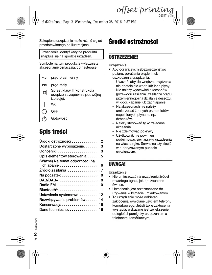 - offset printing D20BT_pl.fm rf-d20bt.book Page 2 Wednesday, December 28, 2016 2:57 PM Zakupione urządzenie może różnić się od przedstawionego na ilustracjach. Oznaczenie identyfikacyjne produktu znajduje się na spodzie urządzeń. Symbole na tym produkcie (włącznie z akcesoriami) oznaczają, co następuje: prąd przemienny prąd stały Sprzęt klasy II (konstrukcja urządzenia zapewnia podwójną izolację). WŁ. OFF Gotowość Spis treści TQBJ2030 Środki ostrożności p. 2