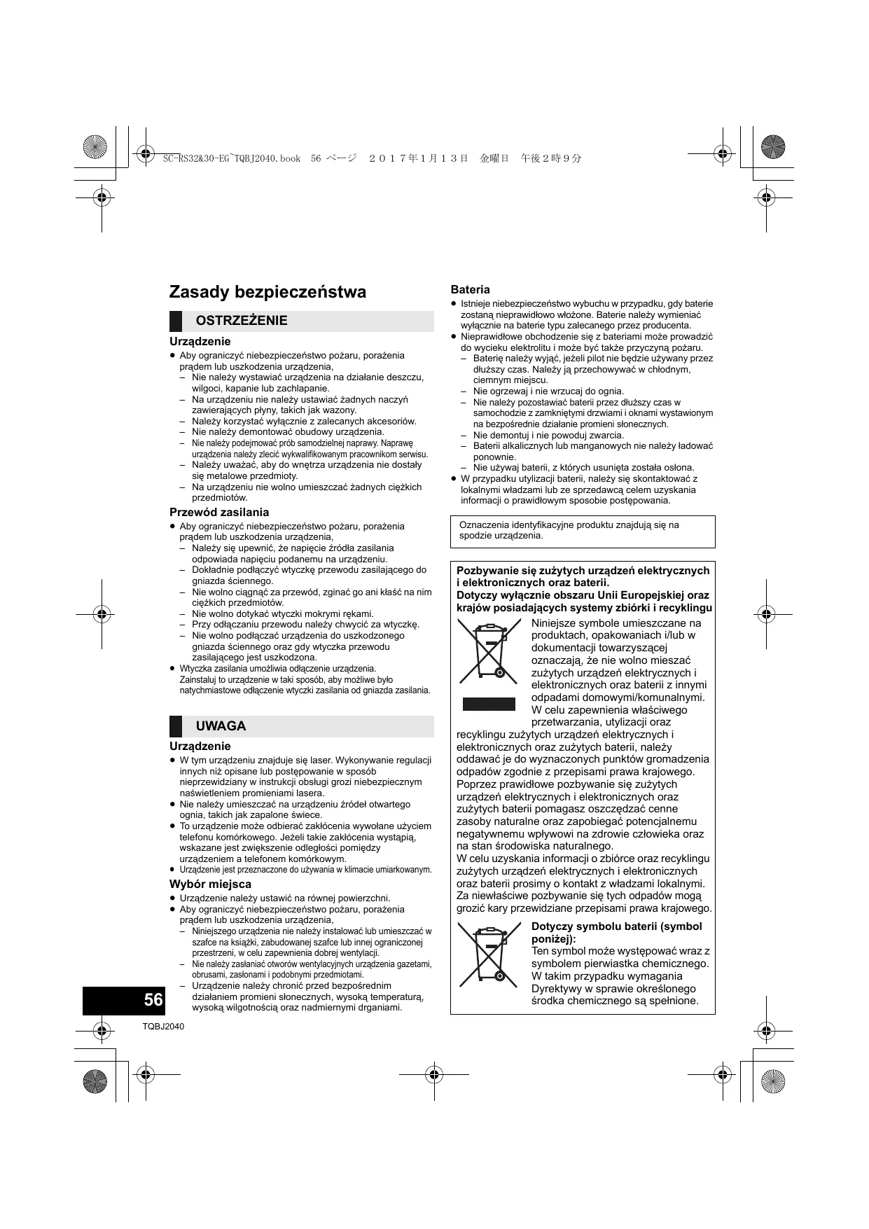Bateria ≥ Istnieje niebezpieczeństwo wybuchu w przypadku, gdy baterie zostaną nieprawidłowo włożone. Baterie należy wymieniać wyłącznie na baterie typu zalecanego przez producenta. ≥ Nieprawidłowe obchodzenie się z bateriami może prowadzić do wycieku elektrolitu i może być także przyczyną pożaru. – Baterię należy wyjąć, jeżeli pilot nie będzie używany przez dłuższy czas. Należy ją przechowywać w chłodnym, ciemnym miejscu. – Nie ogrzewaj i nie wrzucaj do ognia. – Nie należy pozostawiać baterii przez dłuższy czas w samochodzie z zamkniętymi drzwiami i oknami wystawionym na bezpośrednie działanie promieni słonecznych. – Nie demontuj i nie powoduj zwarcia. – Baterii alkalicznych lub manganowych nie należy ładować ponownie. – Nie używaj baterii, z których usunięta została osłona. ≥ W przypadku utylizacji baterii, należy się skontaktować z lokalnymi władzami lub ze sprzedawcą celem uzyskania informacji o prawidłowym sposobie postępowania. Oznaczenia identyfikacyjne produktu znajdują się na spodzie urządzenia. Pozbywanie się zużytych urządzeń elektrycznych i elektronicznych oraz baterii. Dotyczy wyłącznie obszaru Unii Europejskiej oraz krajów posiadających systemy zbiórki i recyklingu Niniejsze symbole umieszczane na produktach, opakowaniach i/lub w dokumentacji towarzyszącej oznaczają, że nie wolno mieszać zużytych urządzeń elektrycznych i elektronicznych oraz baterii z innymi odpadami domowymi/komunalnymi. W celu zapewnienia właściwego przetwarzania, utylizacji oraz recyklingu zużytych urządzeń elektrycznych i elektronicznych oraz zużytych baterii, należy oddawać je do wyznaczonych punktów gromadzenia odpadów zgodnie z przepisami prawa krajowego. Poprzez prawidłowe pozbywanie się zużytych urządzeń elektrycznych i elektronicznych oraz zużytych baterii pomagasz oszczędzać cenne zasoby naturalne oraz zapobiegać potencjalnemu negatywnemu wpływowi na zdrowie człowieka oraz na stan środowiska naturalnego. W celu uzyskania informacji o zbiórce oraz recyklingu zużytych urządzeń elektrycznych i elektronicznych oraz baterii prosimy o kontakt z władzami lokalnymi. Za niewłaściwe pozbywanie się tych odpadów mogą grozić kary przewidziane przepisami prawa krajowego. Dotyczy symbolu baterii (symbol poniżej): Ten symbol może występować wraz z symbolem pierwiastka chemicznego. W takim przypadku wymagania Dyrektywy w sprawie określonego środka chemicznego są spełnione. SC-RS32&30-EG~TQBJ2040.book 57 ページ