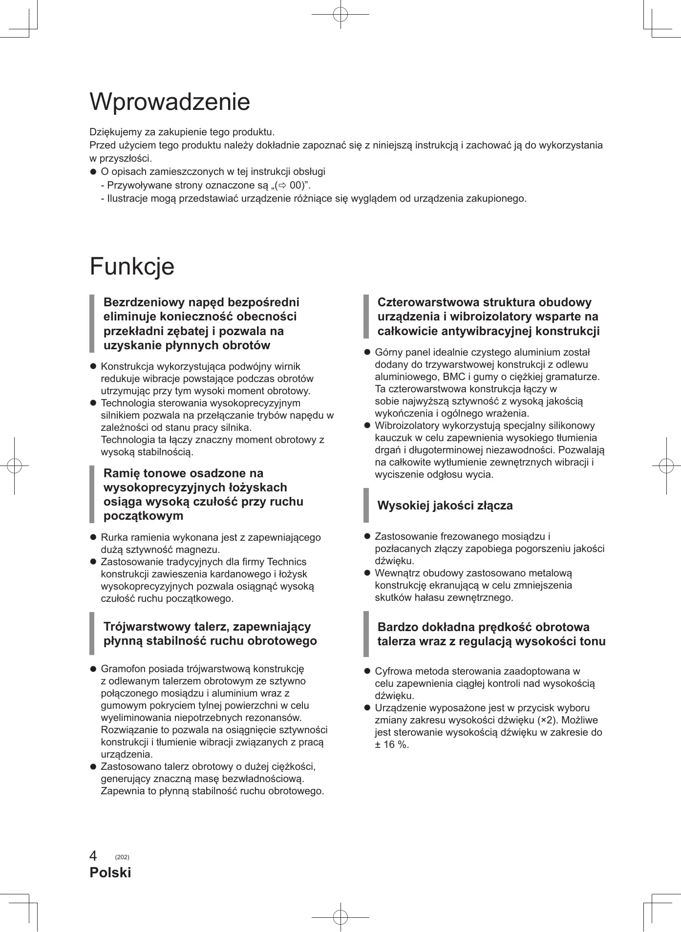 - Suomi (201) Wprowadzenie Dziękujemy za zakupienie tego produktu. Przed użyciem tego produktu należy dokładnie zapoznać się z niniejszą instrukcją i zachować ją do wykorzystania w przyszłości. O opisach zamieszczonych w tej instrukcji obsługi - Przywoływane strony oznaczone są „( 00)”. - Ilustracje mogą przedstawiać urządzenie różniące się wyglądem od urządzenia zakupionego. Funkcje Bezrdzeniowy napęd bezpośredni eliminuje konieczność obecności przekładni zębatej i pozwala na uzyskanie płynnych obrotów Konstrukcja wykorzystująca podwójny wirnik redukuje wibracje powstające podczas obrotów utrzymując przy tym wysoki moment obrotowy. Technologia sterowania wysokoprecyzyjnym silnikiem pozwala na przełączanie trybów napędu w zależności od stanu pracy silnika. Technologia ta łączy znaczny moment obrotowy z wysoką stabilnością. Ramię tonowe osadzone na wysokoprecyzyjnych łożyskach osiąga wysoką czułość przy ruchu początkowym Rurka ramienia wykonana jest z zapewniającego dużą sztywność magnezu. Zastosowanie tradycyjnych dla firmy Technics konstrukcji zawieszenia kardanowego i łożysk wysokoprecyzyjnych pozwala osiągnąć wysoką czułość ruchu początkowego. Trójwarstwowy talerz, zapewniający płynną stabilność ruchu obrotowego Gramofon posiada trójwarstwową konstrukcję z odlewanym talerzem obrotowym ze sztywno połączonego mosiądzu i aluminium wraz z gumowym pokryciem tylnej powierzchni w celu wyeliminowania niepotrzebnych rezonansów. Rozwiązanie to pozwala na osiągnięcie sztywności konstrukcji i tłumienie wibracji związanych z pracą urządzenia. Zastosowano talerz obrotowy o dużej ciężkości, generujący znaczną masę bezwładnościową. Zapewnia to płynną stabilność ruchu obrotowego. 4 (202) Polski Czterowarstwowa struktura obudowy urządzenia i wibroizolatory wsparte na całkowicie antywibracyjnej konstrukcji Górny panel idealnie czystego aluminium został dodany do trzywarstwowej konstrukcji z odlewu aluminiowego, BMC i gumy o ciężkiej gramaturze. Ta czterowarstwowa konstrukcja łączy w sobie najwyższą sztywność z wysoką jakością wykończenia i ogólnego wrażenia. Wibroizolatory wykorzystują specjalny silikonowy kauczuk w celu zapewnienia wysokiego tłumienia drgań i długoterminowej niezawodności. Pozwalają na całkowite wytłumienie zewnętrznych wibracji i wyciszenie odgłosu wycia. Wysokiej jakości złącza Zastosowanie frezowanego mosiądzu i pozłacanych złączy zapobiega pogorszeniu jakości dźwięku. Wewnątrz obudowy zastosowano metalową konstrukcję ekranującą w celu zmniejszenia skutków hałasu zewnętrznego. Bardzo dokładna prędkość obrotowa talerza wraz z regulacją wysokości tonu Cyfrowa metoda sterowania zaadoptowana w celu zapewnienia ciągłej kontroli nad wysokością dźwięku. Urządzenie wyposażone jest w przycisk wyboru zmiany zakresu wysokości dźwięku (×2). Możliwe jest sterowanie wysokością dźwięku w zakresie do ± 16 %. Spis treści Przed użyciem Akcesoria p. 9