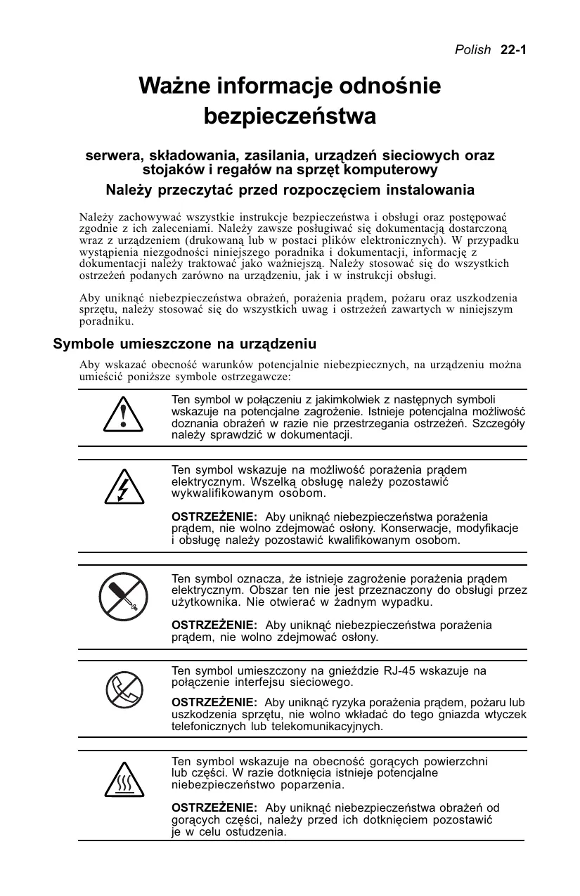 Nie wolno nawet próbowaæ pokonywaæ blokad bezpieczeñstwa (jeli takie s¹ za³o¿one). Drzwiczki do po³¹czeñ PCI na gor¹co daj¹ dostêp do obwodów bêd¹cych ród³em niebezpiecznej energii. q W czasie normalnej pracy urz¹dzenia, drzwiczki te winny byæ zablokowane -lubq Serwer nale¿y instalowaæ wy³¹cznie w miejscu o kontrolowanym dostêpie, gdzie mo¿e wchodziæ tylko wykwalifikowany personel. Przed zdjêciem jakichkolwiek os³on zabezpieczaj¹cych obszary nie pozwalaj¹cych na po³¹czenia na gor¹co, nale¿y wy³¹czyæ zasilanie urz¹dzenia oraz od³¹czyæ wszystkie kable zasilaj¹ce pr¹du zmiennego. Nie wolno wymieniaæ podzespo³ów pozwalaj¹cych na po³¹czenia na gor¹co, gdy w³¹czone jest zasilania urz¹dzenia. Wpierw nale¿y wy³¹czyæ zasilanie urz¹dzenia oraz od³¹czyæ wszystkie kable zasilaj¹ce pr¹du zmiennego. Nie wolno przekraczaæ zakresu dopuszczalnych napraw, podanego w dokumentacji dla odpowiednich procedur naprawczych. Podano tam wszystkie procedury wykrywania i usuwania usterek, które dopuszczaj¹ wykonywanie prac tylko na poziomie podzespo³ów i modu³ów. Ze wzglêdu na z³o¿onoæ poszczególnych p³yt i podzespo³ów, nie wolno nawet próbowaæ wykonywaæ napraw na poziomie poszczególnych czêci lub wewn¹trz podzespo³ów lub te¿ dokonywaæ zmian w p³ytkach obwodów drukowanych. Nieprawid³owa naprawa mo¿e stworzyæ zagro¿enie dla bezpieczeñstwa. Przy urz¹dzeniach stoj¹cych na pod³odze nale¿y za³o¿yæ i rozci¹gn¹æ (rozszerzyæ) stabilizatory na spodzie sprzêtu przed zainstalowaniem urz¹dzeñ opcjonalnych i kart. Sprawdziæ, czy nie jest przeci¹¿ony obwód odga³êziony zasilania stojaka urz¹dzenia. Pozwoli to na zmniejszenie zagro¿enia wypadkiem, po¿arem lub uszkodzeniem sprzêtu. Ca³kowite obci¹¿enie elektryczne tego stojaka nie powinno przekraczaæ 80 % obci¹¿ena znamionowego dla obwodu odga³êzionego. Sposób wykonania okablowania zasilania urz¹dzenia oraz wymogi instalacyjne nale¿y skonsultowaæ z miejscowym zak³adem energetycznym. rodki ostro¿noci dla urz¹dzeñ zasilaj¹cych Kable zasilaj¹ce Aby unikn¹æ niebezpieczeñstwa pora¿enia pr¹dem lub uszkodzenia urz¹dzenia, nale¿y: ■ Stosowaæ tylko prawid³owe, zatwierdzone kable zasilaj¹ce. ■ Jeli komputer (lub ka¿de opcjonalne jego wyposa¿enie zasilanie pr¹dem zmiennym) nie by³ wyposa¿ony w odpowiedni kabel zasilaj¹cy, to nale¿y zakupiæ kabel zasilaj¹cy zatwierdzony do stosowania w Twojej firmie. ■ Nale¿y stosowaæ kabel zasilaj¹cy o danych znamionowych dostosowanych do Twojego urz¹dzenia oraz o napiêciu i pr¹dzie znamionowym takim, jakie podano na elektrycznej tabliczce znamionowej tego urz¹dzenia. Wielkoci znamionowe napiêcia i pr¹du dla tego kabla musz¹ byæ wiêksze od tych wartoci podanych na urz¹dzeniu. ■ W razie jakichkolwiek w¹tpliwoci dotycz¹cych kabla zasilaj¹cego, nale¿y siê skontaktowaæ z autoryzowanym zak³adem serwisowym firmy HP. ■ Nie wolno k³aæ ¿adnych przedmiotów na kablach zasilaj¹cych pr¹du zmiennego. Kable te nale¿y rozmieciæ w taki sposób, aby nikt nie móg³ siê przypadkowo o nie potkn¹æ lub na nie nadepn¹æ. ■ Kabla lub przewodu nie wolno naprê¿aæ. Kabel nale¿y wyci¹gaæ z gniazdka chwytaj¹c za wtyczkê. ■ Nale¿y upewniæ siê, ¿e ca³kowite natê¿enie znamionowe pr¹du wszystkich urz¹dzeñ pod³¹czonych do przed³u¿acza lub listwy zasilaj¹cej nie przekracza 80% dopuszczalnego natê¿enia znamionowego tego przed³u¿acza czy listwy. ■ Nie wolno usuwaæ uziemienia wtyczki kabla zasilaj¹cego. Wtyczka z uziemieniem jest bardzo wa¿nym wyposa¿eniem bezpieczeñstwa. ■ Kabel zasilaj¹cy nale¿y pod³¹czaæ do (uziemionego) gniazdka, które jest zawsze ³atwo dostêpne. 22-4 Polish ród³a zasilania ■ ród³a zasilania pod³¹czane na gor¹co nie s¹ zaprojektowane do ich wyjmowania lub instalowania w czasie, gdy urz¹dzenie jest pod³¹czone do ród³a zasilania pr¹dem zmiennym. W czasie pracy przy ród³ach zasilania pozwalaj¹cych na pod³¹czanie na gor¹co nale¿y przestrzegaæ poni¿szych zasad, aby unikn¹æ niebezpieczeñstwa pora¿enia pr¹dem elektrycznym lub uszkodzenia sprzêtu: q Zasilanie nale¿y instalowaæ przed pod³¹czeniem kabla zasilaj¹cego do sieci. q Przed wymontowaniem uk³adu zasilania z urz¹dzenia, nale¿y wyj¹æ kabel zasilaj¹cy z gniazdka sieciowego. q Jeli system jest wyposa¿ony w wiele róde³ zasilania to nale¿y wyj¹æ wszystkie wtyczki kabli zasilania pr¹dem zmiennym z ich gniazdek, aby ca³kowicie od³¹czyæ zasilanie systemu. ■ Nale¿y sprawdziæ, czy pod³¹czone do urz¹dzenia zewnêtrzne ród³o zasilania jest zgodne z typem ród³a zasilania podanym na tabliczce znamionowej urz¹dzenia. Jeli nie masz pewnoci co do wymaganego typu ród³a zasilania to nale¿y skonsultowaæ siê z autoryzowanym serwisem firmy HP lub z miejscowym zak³adem energetycznym. Urz¹dzenia UPS (do awaryjnego nieprzerywalnego podtrzymywania zasilania) ■ Aby unikn¹æ niebezpieczeñstwa pora¿enia pr¹dem i / lub uszkodzenia sprzêtu podczas instalowania i serwisu urz¹dzeñ UPS, nale¿y przestrzegaæ poni¿szych zasad: q Instalowanie sprzêtu opcjonalnego oraz rutynowe konserwacje i serwis urz¹dzeñ UPS musz¹ byæ wykonywane przez odpowiednio przeszkolonych techników serwisowych, którzy dobrze znaj¹ wszystkie procedury, rodki ostro¿noci oraz zagro¿enia zwi¹zane z urz¹dzeniami elektrycznymi zasilanymi pr¹dem zmiennym. q Wbudowane konstrukcyjnie (uk³adowe) urz¹dzenia UPS wymagaj¹ bezporedniego po³¹czenia z dedykowanym obwodem rozga³êzionym (sieci zasil. pr¹du zmiennego). Po³¹czenie to powinno byæ wykonane przez uprawnionego elektryka, w sposób zgodny z Artyku³em 310 Pañstwowych Przepisów Elektrycznych (NFPA70 Article 310) obowi¹zuj¹cych w USA lub (odpowiadaj¹cymi mu) przepisami lokalnymi i pañstwowymi w kraju instalowania tego UPS-u. q Przed rozpoczêciem serwisu urz¹dzenia lub wymian¹ jego czêci nie po