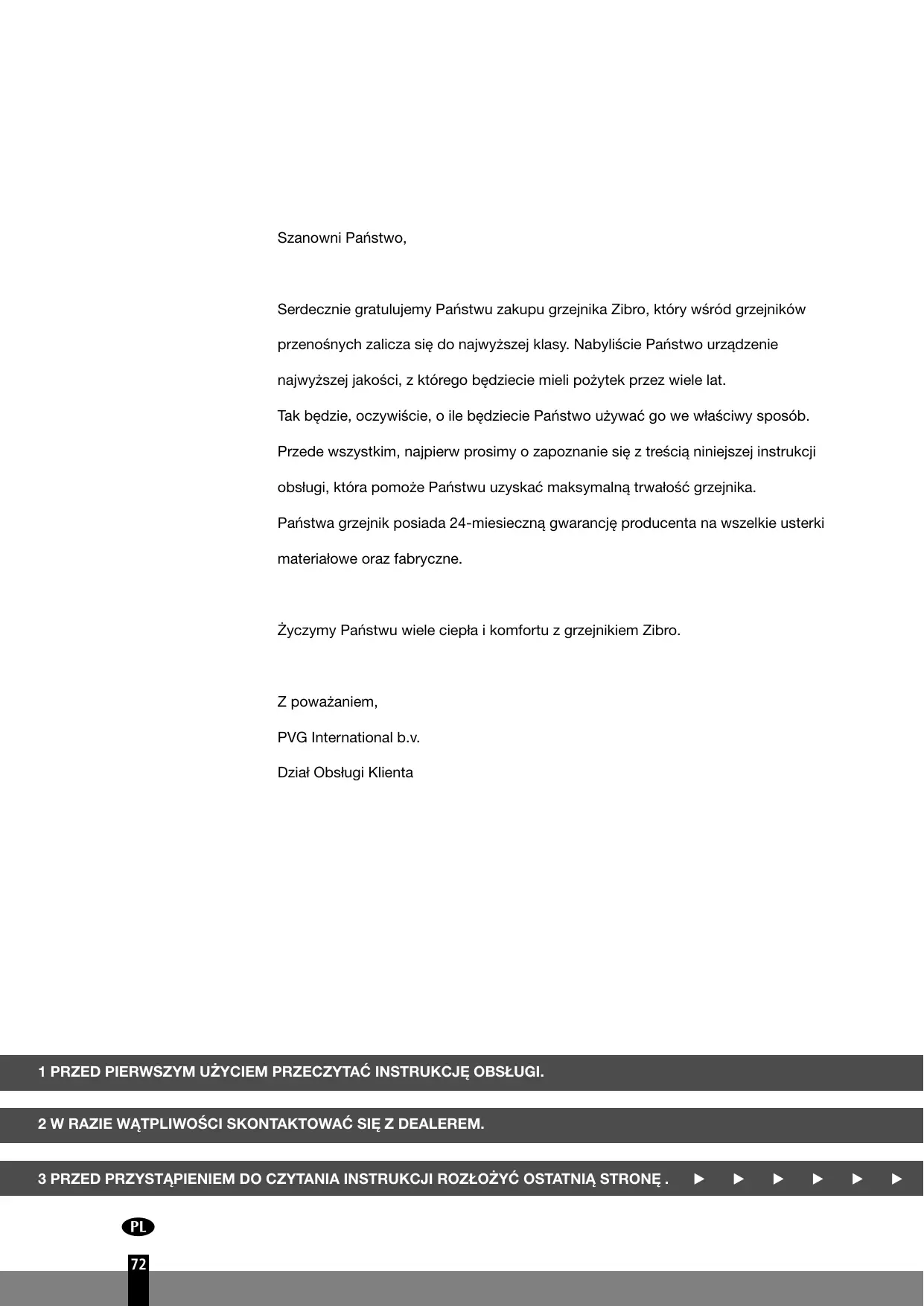 Szanowni Państwo, Serdecznie gratulujemy Państwu zakupu grzejnika Zibro, który wśród grzejników przenośnych zalicza się do najwyższej klasy. Nabyliście Państwo urządzenie najwyższej jakości, z którego będziecie mieli pożytek przez wiele lat. Tak będzie, oczywiście, o ile będziecie Państwo używać go we właściwy sposób. Przede wszystkim, najpierw prosimy o zapoznanie się z treścią niniejszej instrukcji obsługi, która pomoże Państwu uzyskać maksymalną trwałość grzejnika. Państwa grzejnik posiada 24miesieczną gwarancję producenta na wszelkie usterki materiałowe oraz fabryczne. Życzymy Państwu wiele ciepła i komfortu z grzejnikiem Zibro. Z poważaniem, PVG International b.v. Dział Obsługi Klienta 1 PRZED PIERWSZYM UŻYCIEM PRZECZYTAĆ INSTRUKCJE˛ OBSŁUGI. 2 W RAZIE WĄTPLIWOŚCI SKONTAKTOWAĆ SIE˛ Z DEALEREM. 3 PRZED PRZYSTĄPIENIEM DO CZYTANIA INSTRUKCJI ROZŁOŻYĆ OSTATNIĄ STRONE˛ .