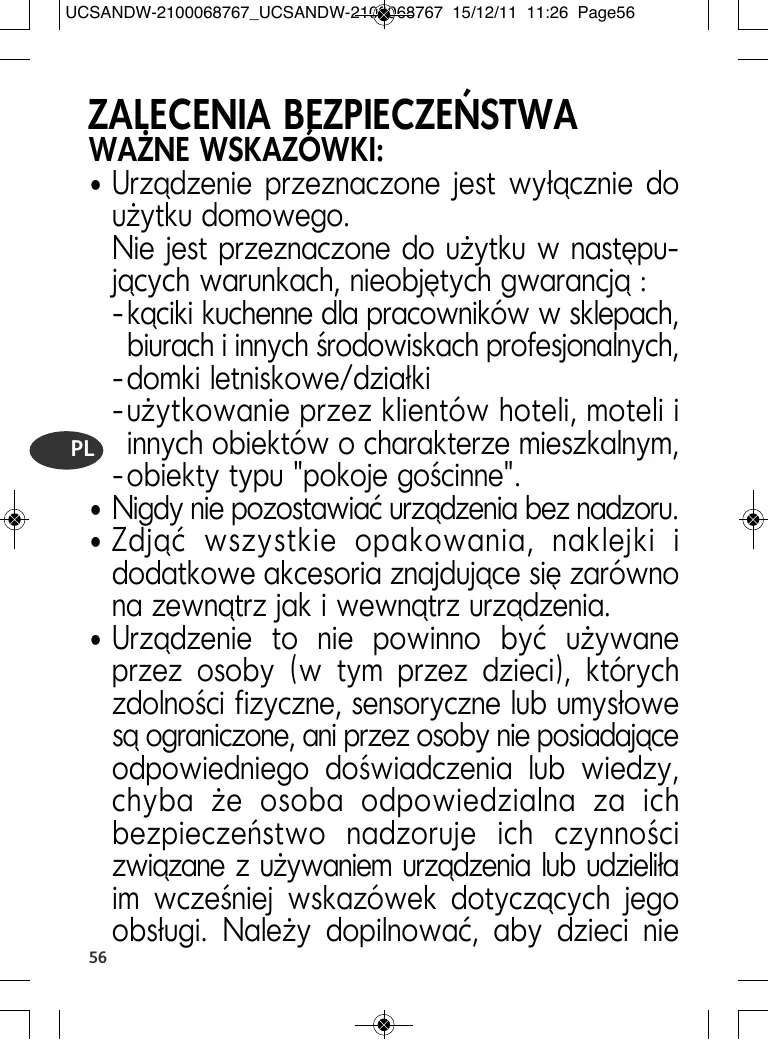 ZALECENIA BEZPIECZEŃSTWA WAŻNE WSKAZÓWKI: • Urządzenie przeznaczone jest wyłącznie do użytku domowego. Nie jest przeznaczone do użytku w następujących warunkach, nieobjętych gwarancją : -kąciki kuchenne dla pracowników w sklepach, biurach i innych środowiskach profesjonalnych, -domki letniskowe/działki -użytkowanie przez klientów hoteli, moteli i PL innych obiektów o charakterze mieszkalnym, -obiekty typu "pokoje gościnne". • Nigdy nie pozostawiać urządzenia bez nadzoru. • Zdjąć wszystkie opakowania, naklejki i dodatkowe akcesoria znajdujące się zarówno na zewnątrz jak i wewnątrz urządzenia. • Urządzenie to nie powinno być używane przez osoby (w tym przez dzieci), których zdolności fizyczne, sensoryczne lub umysłowe są ograniczone, ani przez osoby nie posiadające odpowiedniego doświadczenia lub wiedzy, chyba że osoba odpowiedzialna za ich bezpieczeństwo nadzoruje ich czynności związane z używaniem urządzenia lub udzieliła im wcześniej wskazówek dotyczących jego obsługi. Należy dopilnować, aby dzieci nie 56