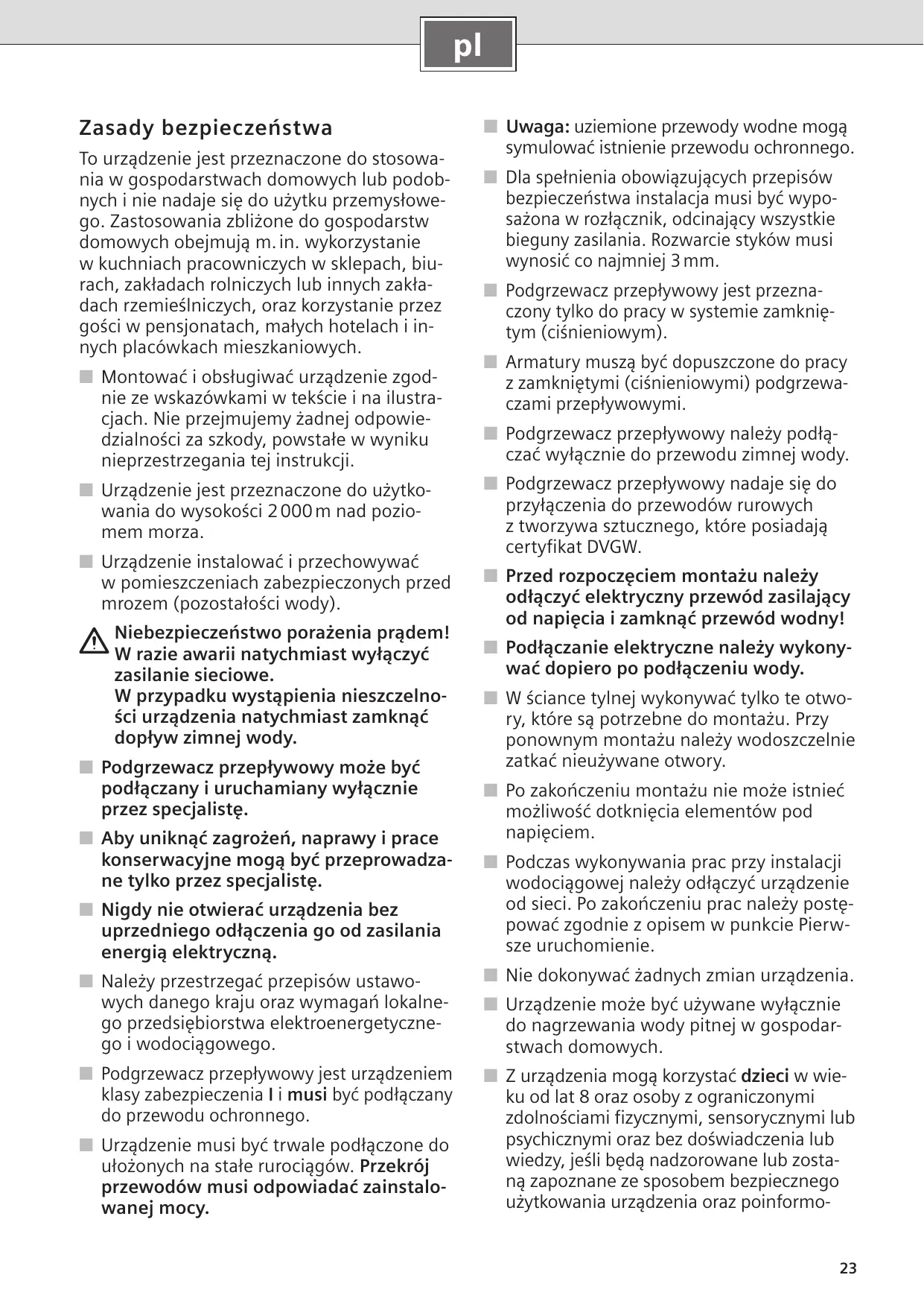 Zasady bezpieczeństwa To urządzenie jest przeznaczone do stosowania w gospodarstwach domowych lub podobnych i nie nadaje się do użytku przemysłowego. Zastosowania zbliżone do gospodarstw domowych obejmują m. in. wykorzystanie w kuchniach pracowniczych w sklepach, biurach, zakładach rolniczych lub innych zakładach rzemieślniczych, oraz korzystanie przez gości w pensjonatach, małych hotelach i innych placówkach mieszkaniowych. ■ Montować i obsługiwać urządzenie zgodnie ze wskazówkami w tekście i na ilustracjach. Nie przejmujemy żadnej odpowiedzialności za szkody, powstałe w wyniku nieprzestrzegania tej instrukcji. ■ Urządzenie jest przeznaczone do użytkowania do wysokości 2 000 m nad poziomem morza. ■ Urządzenie instalować i przechowywać w pomieszczeniach zabezpieczonych przed mrozem (pozostałości wody). Niebezpieczeństwo porażenia prądem! W razie awarii natychmiast wyłączyć zasilanie sieciowe. W przypadku wystąpienia nieszczelności urządzenia natychmiast zamknąć dopływ zimnej wody. ■ Podgrzewacz przepływowy może być podłączany i uruchamiany wyłącznie przez specjalistę. ■ Aby uniknąć zagrożeń, naprawy i prace konserwacyjne mogą być przeprowadzane tylko przez specjalistę. ■ Nigdy nie otwierać urządzenia bez uprzedniego odłączenia go od zasilania energią elektryczną. ■ Uwaga: uziemione przewody wodne mogą symulować istnienie przewodu ochronnego. ■ Dla spełnienia obowiązujących przepisów bezpieczeństwa instalacja musi być wyposażona w rozłącznik, odcinający wszystkie bieguny zasilania. Rozwarcie styków musi wynosić co najmniej 3 mm. ■ Podgrzewacz przepływowy jest przeznaczony tylko do pracy w systemie zamkniętym (ciśnieniowym). ■ Armatury muszą być dopuszczone do pracy z zamkniętymi (ciśnieniowymi) podgrzewaczami przepływowymi. ■ Podgrzewacz przepływowy należy podłączać wyłącznie do przewodu zimnej wody. ■ Podgrzewacz przepływowy nadaje się do przyłączenia do przewodów rurowych z tworzywa sztucznego, które posiadają certyfikat DVGW. ■ Przed rozpoczęciem montażu należy odłączyć elektryczny przewód zasilający od napięcia i zamknąć przewód wodny! ■ Podłączanie elektryczne należy wykonywać dopiero po podłączeniu wody. ■ W ściance tylnej wykonywać tylko te otwory, które są potrzebne do montażu. Przy ponownym montażu należy wodoszczelnie zatkać nieużywane otwory. ■ Po zakończeniu montażu nie może istnieć możliwość dotknięcia elementów pod napięciem. ■ Podczas wykonywania prac przy instalacji wodociągowej należy odłączyć urządzenie od sieci. Po zakończeniu prac należy postępować zgodnie z opisem w punkcie Pierwsze uruchomienie. ■ Należy przestrzegać przepisów ustawowych danego kraju oraz wymagań lokalnego przedsiębiorstwa elektroenergetycznego i wodociągowego. ■ Nie dokonywać żadnych zmian urządzenia. ■ Podgrzewacz przepływowy jest urządzeniem klasy zabezpieczenia I i musi być podłączany do przewodu ochronnego. ■ Z urządzenia mogą korzystać dzieci w wieku od lat 8 oraz osoby z ograniczonymi zdolnościami fizycznymi, sensorycznymi lub psychicznymi oraz bez doświadczenia lub wiedzy, jeśli będą nadzorowane lub zostaną zapoznane ze sposobem bezpiecznego użytkowania urządzenia oraz poinformo- ■ Urządzenie musi być trwale podłączone do ułożonych na stałe rurociągów. Przekrój przewodów musi odpowiadać zainstalowanej mocy. ■ Urządzenie może być używane wyłącznie do nagrzewania wody pitnej w gospodarstwach domowych.
