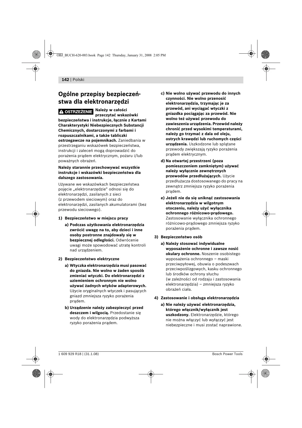 a) Wtyczka elektronarzędzia musi pasować do gniazda. Nie wolno w żaden sposób zmieniać wtyczki. Do elektronarzędzi z uziemieniem ochronnym nie wolno używać żadnych wtyków adapterowych. Użycie oryginalnych wtyczek i pasujących gniazd zmniejsza ryzyko porażenia prądem. b) Urządzenie należy zabezpieczyć przed deszczem i wilgocią. Przedostanie się wody do elektronarzędzia podwyższa ryzyko porażenia prądem. 1 609 929 R18 | (31.1.08) c) Nie wolno używać przewodu do innych czynności. Nie wolno przenosić elektronarzędzia, trzymając je za przewód, ani wyciągać wtyczki z gniazdka pociągając za przewód. Nie wolno też używać przewodu do zawieszenia urządzenia. Przewód należy chronić przed wysokimi temperaturami, należy go trzymać z dala od oleju, ostrych krawędzi lub ruchomych części urządzenia. Uszkodzone lub splątane przewody zwiększają ryzyko porażenia prądem elektrycznym. d) Na otwartej przestrzeni (poza pomieszczeniem zamkniętym) używać należy wyłącznie zewnętrznych przewodów przedłużających. Użycie przedłużacza dostosowanego do pracy na zewnątrz zmniejsza ryzyko porażenia prądem. e) Jeżeli nie da się uniknąć zastosowania elektronarzędzia w wilgotnym otoczeniu, należy użyć wyłącznika ochronnego różnicowo-prądowego. Zastosowanie wyłącznika ochronnego różnicowo-prądowego zmniejsza ryzyko porażenia prądem.
