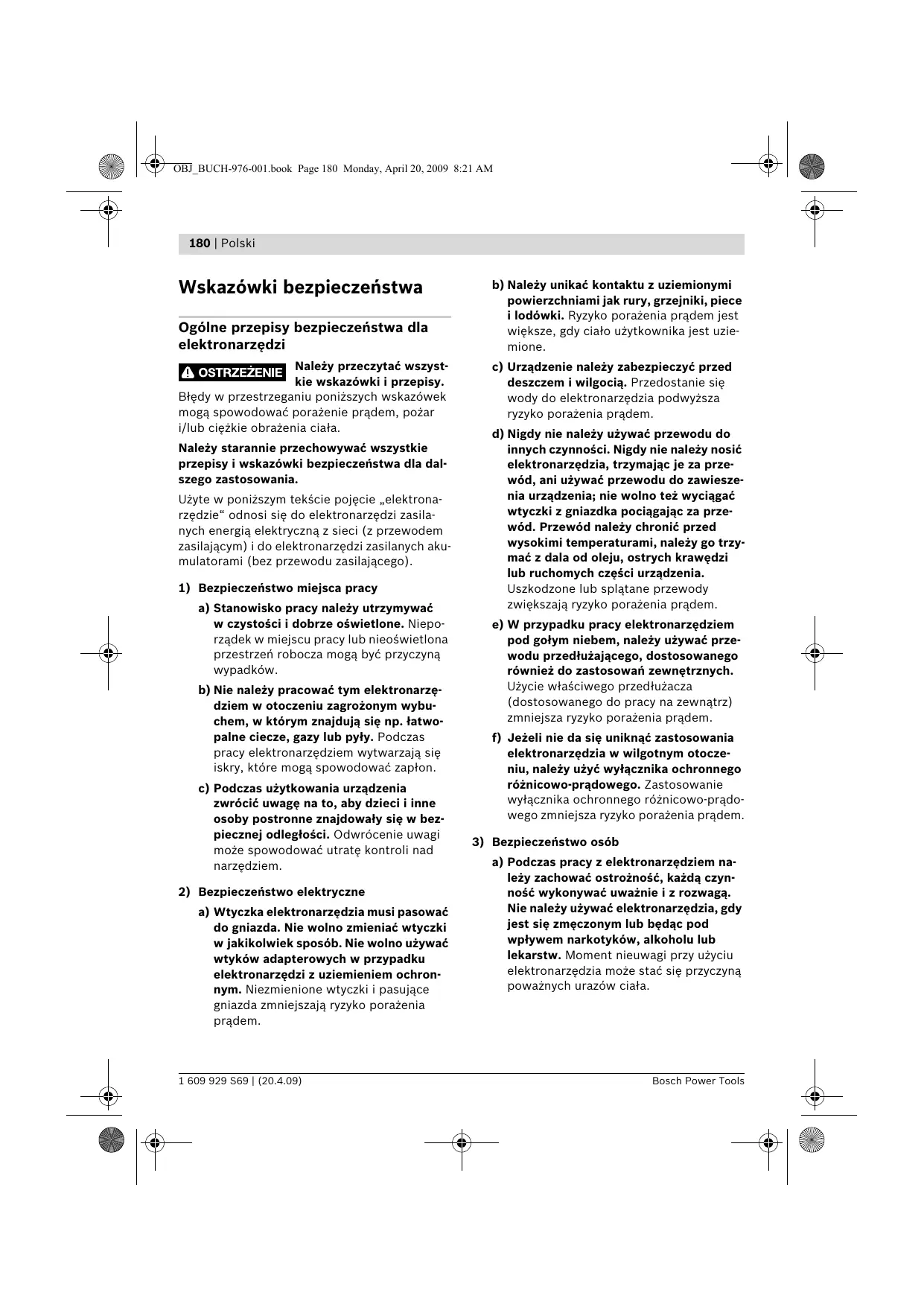 a) Podczas pracy z elektronarzędziem należy zachować ostrożność, każdą czynność wykonywać uważnie i z rozwagą. Nie należy używać elektronarzędzia, gdy jest się zmęczonym lub będąc pod wpływem narkotyków, alkoholu lub lekarstw. Moment nieuwagi przy użyciu elektronarzędzia może stać się przyczyną poważnych urazów ciała. Bosch Power Tools OBJ_BUCH-976-001.book Page 181 Monday, April 20, 2009 8:21 AM Polski | 181 b) Należy nosić osobiste wyposażenie ochronne i zawsze okulary ochronne. Noszenie osobistego wyposażenia ochronnego – maski przeciwpyłowej, obuwia z podeszwami przeciwpoślizgowymi, kasku ochronnego lub środków ochrony słuchu (w zależności od rodzaju i zastosowania elektronarzędzia) – zmniejsza ryzyko obrażeń ciała. c) Należy unikać niezamierzonego uruchomienia narzędzia. Przed włożeniem wtyczki do gniazdka i/lub podłączeniem do akumulatora, a także przed podniesieniem lub przeniesieniem elektronarzędzia, należy upewnić się, że elektronarzędzie jest wyłączone. Trzymanie palca na wyłączniku podczas przenoszenia elektronarzędzia lub podłączenie do prądu włączonego narzędzia, może stać się przyczyną wypadków. d) Przed włączeniem elektronarzędzia, należy usunąć narzędzia nastawcze lub klucze. Narzędzie lub klucz, znajdujący się w ruchomych częściach urządzenia mogą doprowadzić do obrażeń ciała. e) Należy unikać nienaturalnych pozycji przy pracy. Należy dbać o stabilną pozycję przy pracy i zachowanie równowagi. W ten sposób możliwa będzie lepsza kontrola elektronarzędzia w nieprzewidzianych sytuacjach. f) Należy nosić odpowiednie ubranie. Nie należy nosić luźnego ubrania ani biżuterii. Włosy, ubranie i rękawice należy trzymać z daleka od ruchomych części. Luźne ubranie, biżuteria lub długie włosy mogą zostać wciągnięte przez ruchome części. g) Jeżeli istnieje możliwość zamontowania urządzeń odsysających i wychwytujących pył, należy upewnić się, że są one podłączone i będą prawidłowo użyte. Użycie urządzenia odsysającego pył może zmniejszyć zagrożenie pyłami. Bosch Power Tools