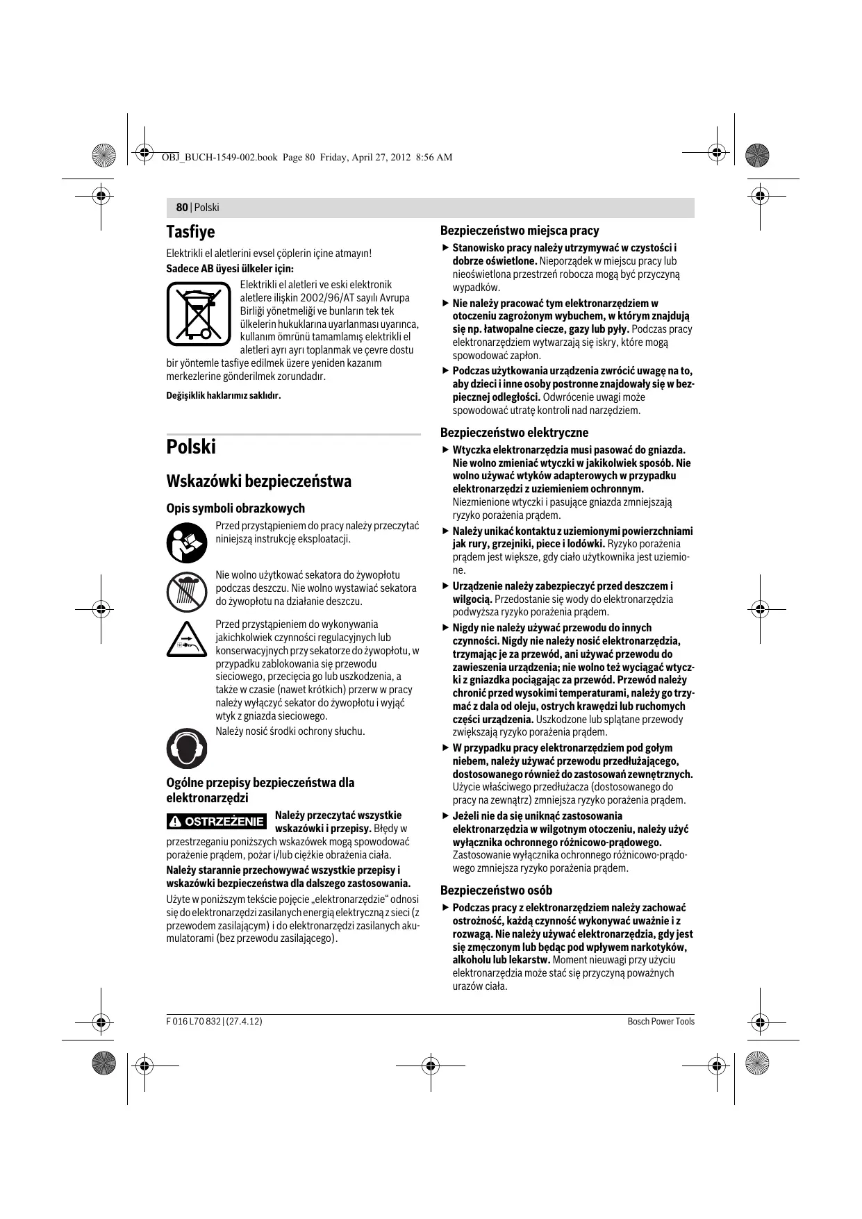 Podany w niniejszej instrukcji poziom drgań pomierzony został zgodnie z określoną przez normę EN 60745 procedurą pomiarową i może zostać użyty do porównywania elektronarzędzi. Można go też użyć do wstępnej oceny ekspozycji na drgania. F 016 L70 832 | (27.4.12)