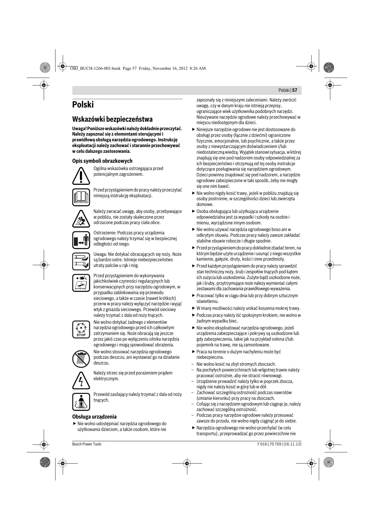 Denizli Tel.: 0258 2620666 Bulut Elektrik İstasyon Cad. No: 52/B Devlet Tiyatrosu Karşısı Elazığ Tel.: 0424 2183559 Körfez Elektrik Sanayi Çarşısı 770 Sok. No: 71 Erzincan Tel.: 0446 2230959 Ege Elektrik İnönü Bulvaro No: 135 Muğla Makasarası Fethiye Fethiye F 016 L70 769 | (16.11.12) Giderilme yolu Bahçe aletini kapatın Tıkanmaya giderin (daima bahçe eldivenleri kullanın) Bıçak somununu/-cıvatasını sıkın (17 Nm) Bıçak somununu/-cıvatasını sıkın (17 Nm) Bıçak değiştirme Tel.: 0252 6145701 Değer İş Bobinaj İsmetpaşa Mah. İlk Belediye Başkan Cad. 5/C Şahinbey Gaziantep Tel.: 0342 2316432 Çözüm Bobinaj İsmetpaşa Mah. Eski Şahinbey Belediyesi altı Cad. No: 3/C Gaziantep Tel.: 0342 2319500 Onarım Bobinaj Raifpaşa Cad. No: 67 İskenderun Hatay Tel.: 0326 6137546 Günşah Otomotiv Beylikdüzü Sanayi Sit. No: 210 Beylikdüzü İstanbul Tel.: 0212 8720066 Aygem 10021 Sok. No: 11 AOSB Çiğli İzmir Tel.: 0232 3768074 Sezmen Bobinaj Ege İş Merkezi 1201/4 Sok. No: 4/B Yenişehir İzmir Tel.: 0232 4571465 Ankaralı Elektrik Eski Sanayi Bölgesi 3. Cad. No: 43 Kayseri Tel.: 0352 3364216 Asal Bobinaj Eski Sanayi Sitesi Barbaros Cad. No: 24 Samsun Tel.: 0362 2289090 Üstündağ Elektrikli Aletler Nusretiye Mah. Boyacılar Aralığı No: 9 Tekirdağ Tel.: 0282 6512884 Tasfiye Bahçe aletlerini evsel çöplerin içine atmayın! Sadece AB üyesi ülkeler için: Elektronik ve elektrikli aletlere ilişkin 2002/96/AT sıyılı Avrupa yönetmeliği ve bu yönetmeliğin ulusal hukuka uyarlanmış hükümleri uyarınca kullanım ömrünü tamamlamış elektronik ve elektrikli aletler ayrı ayrı toplanmak ve çevre dostu tasfiye amacıyla geri kazanım merkezlerine gönderilmek zorundadır. Değişiklik haklarımız saklıdır. Bosch Power Tools OBJ_BUCH-1266-003.book Page 57 Friday, November 16, 2012 8:26 AM Polski | 57 Polski Wskazówki bezpieczeństwa Uwaga! Poniższe wskazówki należy dokładnie przeczytać. Należy zapoznać się z elementami sterującymi i prawidłową obsługą narzędzia ogrodowego. Instrukcję eksploatacji należy zachować i starannie przechowywać w celu dalszego zastosowania. Opis symboli obrazkowych Ogólna wskazówka ostrzegająca przed potencjalnym zagrożeniem. Przed przystąpieniem do pracy należy przeczytać niniejszą instrukcję eksploatacji. Należy zwracać uwagę, aby osoby, przebywające w pobliżu, nie zostały skaleczone przez odrzucone podczas pracy ciała obce. Ostrzeżenie: Podczas pracy urządzenia ogrodowego należy trzymać się w bezpiecznej odległości od niego. Uwaga: Nie dotykać obracających się noży. Noże są bardzo ostre. Istnieje niebezpieczeństwo utraty palców u rąk i nóg. Przed przystąpieniem do wykonywania jakichkolwiek czynności regulacyjnych lub konserwacyjnych przy narzędziu ogrodowym, w przypadku zablokowania się przewodu sieciowego, a także w czasie (nawet krótkich) przerw w pracy należy wyłączyć narzędzie i wyjąć wtyk z gniazda sieciowego. Przewód sieciowy należy trzymać z dala od noży tnących. Nie wolno dotykać żadnego z elementów narzędzia ogrodowego przed ich całkowitym zatrzymaniem się. Noże obracają się jeszcze przez jakiś czas po wyłączeniu silnika narzędzia ogrodowego i mogą spowodować obrażenia. Nie wolno stosować narzędzia ogrodowego podczas deszczu, ani wystawiać go na działanie deszczu. Należy strzec się przed porażeniem prądem elektrycznym. Przewód zasilający należy trzymać z dala od noży tnących. Obsługa urządzenia Nie wolno udostępniać narzędzia ogrodowego do użytkowania dzieciom, a także osobom, które nie Bosch Power Tools zapoznały się z niniejszymi zaleceniami. Należy zwrócić uwagę, czy w danym kraju nie istnieją przepisy, ograniczające wiek użytkownika podobnych narzędzi. Nieużywane narzędzie ogrodowe należy przechowywać w miejscu niedostępnym dla dzieci. Niniejsze narzędzie ogrodowe nie jest dostosowane do obsługi przez osoby (łącznie z dziećmi) ograniczone fizycznie, emocjonalnie, lub psychicznie, a także przez osoby z niewystarczającym doświadczeniem i/lub niedostateczną wiedzą. Wyjątek stanowi sytuacja, w której znajdują się one pod nadzorem osoby odpowiedzialnej za ich bezpieczeństwo i otrzymują od tej osoby instrukcje dotyczące posługiwania się narzędziem ogrodowym. Dzieci powinny znajdować się pod nadzorem, a narzędzie ogrodowe zabezpieczone w taki sposób, żeby nie mogły się one nim bawić. Nie wolno nigdy kosić trawy, jeżeli w pobliżu znajdują się osoby postronne, w szczególności dzieci lub zwierzęta domowe. Osoba obsługująca lub użytkująca urządzenie odpowiedzialna jest za wypadki i szkody na osobie i mieniu, wyrządzone innym osobom. Nie wolno używać narzędzia ogrodowego boso ani w odkrytym obuwiu. Podczas pracy należy zawsze zakładać stabilne obuwie robocze i długie spodnie. Przed przystąpieniem do pracy dokładnie zbadać teren, na którym będzie użyte urządzenie i usunąć z niego wszystkie kamienie, gałęzie, druty, kości i inne przedmioty. Przed każdym przystąpieniem do pracy należy sprawdzić stan techniczny noży, śrub i zespołów tnących pod kątem ich zużycia lub uszkodzenia. Zużyte bądź uszkodzone noże, jak i śruby, przytrzymujące noże należy wymieniać całymi zestawami dla zachowania prawidłowego wyważenia. Pracować tylko w ciągu dnia lub przy dobrym sztucznym oświetleniu. W miarę możliwości należy unikać koszenia mokrej trawy. Podczas pracy należy iść spokojnym krokiem, nie wolno w żadnym wypadku biec. Nie wolno eksploatować narzędzia ogrodowego, jeżeli urządzenia zabezpieczające i pokrywy są uszkodzone lub gdy zabezpieczenia, takie jak na przykład osłona i/lub pojemnik na trawę, nie są zamontowane. Praca na terenie o dużym nachyleniu może być niebezpieczna. – Nie wolno kosić na zbyt stromych zboczach. – Na pochyłych powierzchniach lub wilgotnej trawie należy pracowa