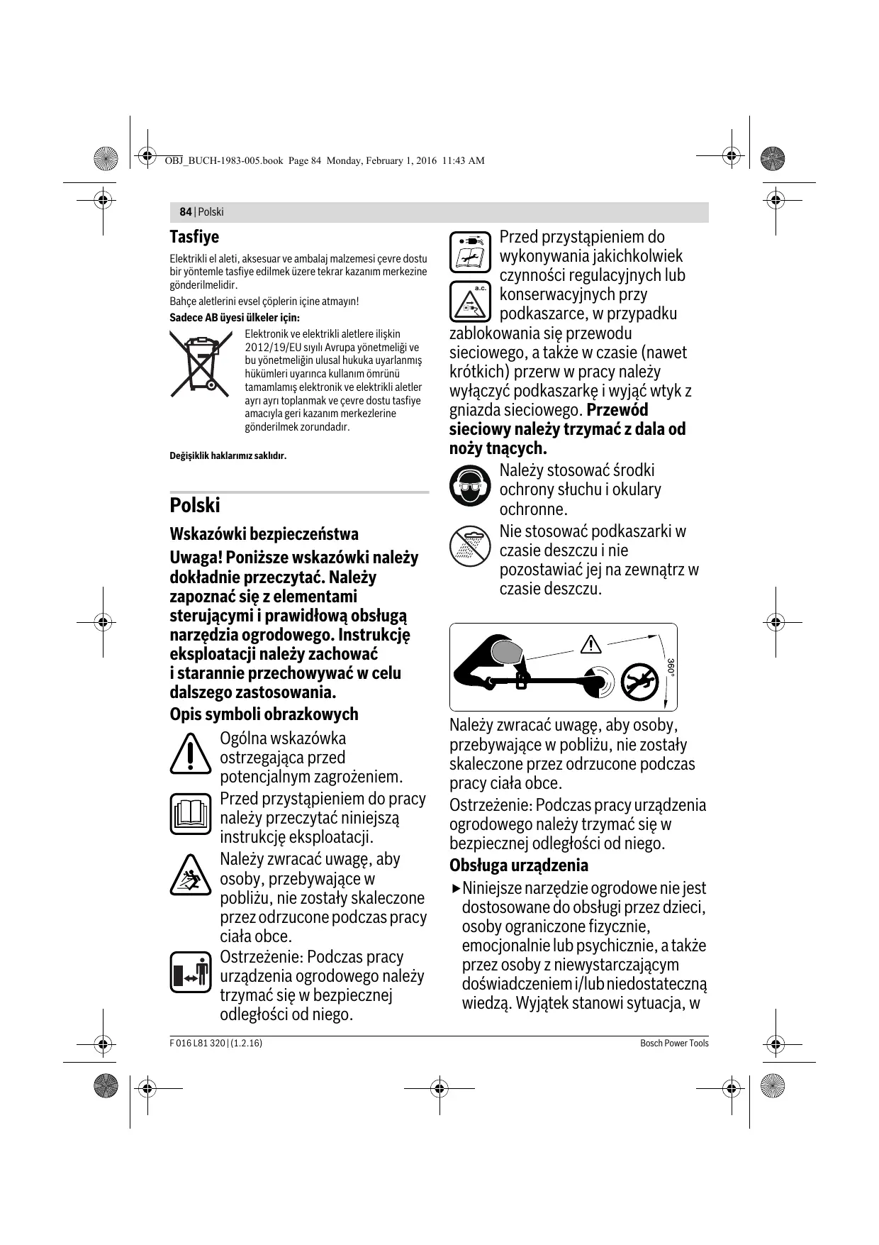 Denizli Tel.: 0258 2620666 Bulut Elektrik İstasyon Cad. No: 52/B Devlet Tiyatrosu Karşısı Elazığ Tel.: 0424 2183559 Körfez Elektrik Sanayi Çarşısı 770 Sok. No: 71 Erzincan Tel.: 0446 2230959 Bosch Power Tools Ege Elektrik İnönü Bulvaro No: 135 Muğla Makasarası Fethiye Fethiye Tel.: 0252 6145701 Değer İş Bobinaj İsmetpaşa Mah. İlk Belediye Başkan Cad. 5/C Şahinbey Gaziantep Tel.: 0342 2316432 Çözüm Bobinaj İsmetpaşa Mah. Eski Şahinbey Belediyesi altı Cad. No: 3/C Gaziantep Tel.: 0342 2319500 Onarım Bobinaj Raifpaşa Cad. No: 67 İskenderun Hatay Tel.: 0326 6137546 Günşah Otomotiv Beylikdüzü Sanayi Sit. No: 210 Beylikdüzü İstanbul Tel.: 0212 8720066 Aygem 10021 Sok. No: 11 AOSB Çiğli İzmir Tel.: 0232 3768074 Sezmen Bobinaj Ege İş Merkezi 1201/4 Sok. No: 4/B Yenişehir İzmir Tel.: 0232 4571465 Ankaralı Elektrik Eski Sanayi Bölgesi 3. Cad. No: 43 Kayseri Tel.: 0352 3364216 Asal Bobinaj Eski Sanayi Sitesi Barbaros Cad. No: 24 Samsun Tel.: 0362 2289090 Üstündağ Elektrikli Aletler Nusretiye Mah. Boyacılar Aralığı No: 9 Tekirdağ Tel.: 0282 6512884 F 016 L81 320 | (1.2.16) OBJ_BUCH-1983-005.book Page 84 Monday, February 1, 2016 11:43 AM 84 | Polski Tasfiye Elektrikli el aleti, aksesuar ve ambalaj malzemesi çevre dostu bir yöntemle tasfiye edilmek üzere tekrar kazanım merkezine gönderilmelidir. Bahçe aletlerini evsel çöplerin içine atmayın! Sadece AB üyesi ülkeler için: Elektronik ve elektrikli aletlere ilişkin 2012/19/EU sıyılı Avrupa yönetmeliği ve bu yönetmeliğin ulusal hukuka uyarlanmış hükümleri uyarınca kullanım ömrünü tamamlamış elektronik ve elektrikli aletler ayrı ayrı toplanmak ve çevre dostu tasfiye amacıyla geri kazanım merkezlerine gönderilmek zorundadır. Değişiklik haklarımız saklıdır. Polski Wskazówki bezpieczeństwa Uwaga! Poniższe wskazówki należy dokładnie przeczytać. Należy zapoznać się z elementami sterującymi i prawidłową obsługą narzędzia ogrodowego. Instrukcję eksploatacji należy zachować i starannie przechowywać w celu dalszego zastosowania. Opis symboli obrazkowych Ogólna wskazówka ostrzegająca przed potencjalnym zagrożeniem. Przed przystąpieniem do pracy należy przeczytać niniejszą instrukcję eksploatacji. Należy zwracać uwagę, aby osoby, przebywające w pobliżu, nie zostały skaleczone przez odrzucone podczas pracy ciała obce. Ostrzeżenie: Podczas pracy urządzenia ogrodowego należy trzymać się w bezpiecznej odległości od niego. F 016 L81 320 | (1.2.16) Przed przystąpieniem do wykonywania jakichkolwiek czynności regulacyjnych lub konserwacyjnych przy podkaszarce, w przypadku zablokowania się przewodu sieciowego, a także w czasie (nawet krótkich) przerw w pracy należy wyłączyć podkaszarkę i wyjąć wtyk z gniazda sieciowego. Przewód sieciowy należy trzymać z dala od noży tnących. Należy stosować środki ochrony słuchu i okulary ochronne. Nie stosować podkaszarki w czasie deszczu i nie pozostawiać jej na zewnątrz w czasie deszczu. Należy zwracać uwagę, aby osoby, przebywające w pobliżu, nie zostały skaleczone przez odrzucone podczas pracy ciała obce. Ostrzeżenie: Podczas pracy urządzenia ogrodowego należy trzymać się w bezpiecznej odległości od niego. Obsługa urządzenia Niniejsze narzędzie ogrodowe nie jest dostosowane do obsługi przez dzieci, osoby ograniczone fizycznie, emocjonalnie lub psychicznie, a także przez osoby z niewystarczającym doświadczeniem i/lub niedostateczną wiedzą. Wyjątek stanowi sytuacja, w Bosch Power Tools OBJ_BUCH-1983-005.book Page 85 Monday, February 1, 2016 11:43 AM Polski | 85 której znajdują się one pod nadzorem osoby odpowiedzialnej za ich bezpieczeństwo i otrzymują od tej osoby instrukcje dotyczące posługiwania się narzędziem ogrodowym. Dzieci powinny znajdować się pod nadzorem, a narzędzie ogrodowe zabezpieczone w taki sposób, żeby nie mogły się one nim bawić. Nie wolno udostępniać podkaszarki do użytkowania dzieciom, a także osobom, które nie zapoznały się z niniejszymi zaleceniami. Należy zwrócić uwagę, czy w danym kraju nie istnieją przepisy, ograniczające wiek użytkownika podobnych narzędzi. Nieużywaną podkaszarkę należy przechowywać w miejscu niedostępnym dla dzieci. Nie używać podkaszarek z uszkodzonymi bądź zdemontowanymi pokrywami lub zabezpieczeniami, a także wówczas, gdy nie znajdują się one na swoim miejscu. Przed przystąpieniem do pracy przewody sieciowe i przedłużacze należy zawsze kontrolować pod kątem uszkodzeń oraz stopnia zużycia. W przypadku uszkodzenia przewodu podczas pracy należy natychmiast wyjąć wtyczkę z gniazda. NIE WOLNO DOTYKAĆ