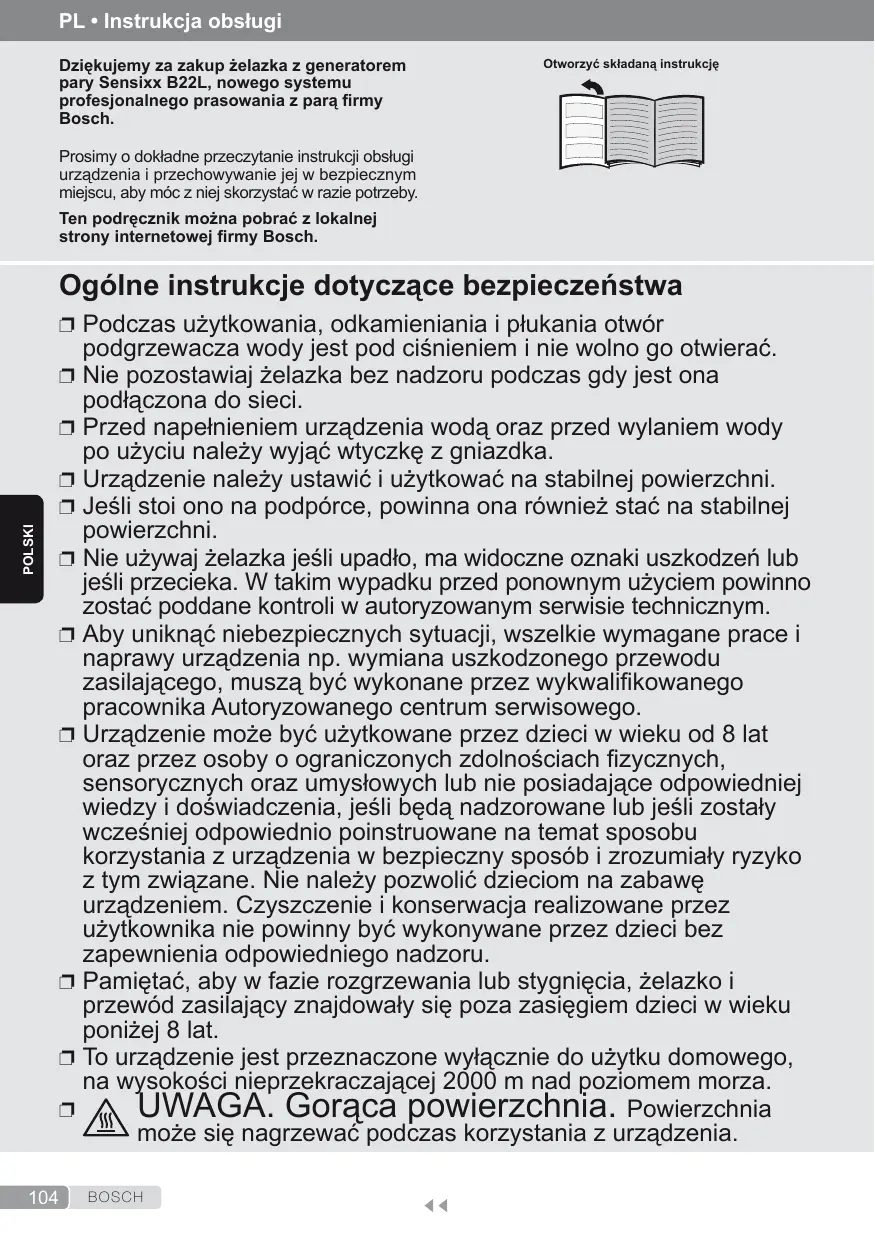 PL • Instrukcja obsługi Dziękujemy za zakup żelazka z generatorem pary Sensixx B22L, nowego systemu profesjonalnego prasowania z parą firmy Bosch. Otworzyć składaną instrukcję Prosimy o dokładne przeczytanie instrukcji obsługi urządzenia i przechowywanie jej w bezpiecznym miejscu, aby móc z niej skorzystać w razie potrzeby. Ten podręcznik można pobrać z lokalnej strony internetowej firmy Bosch. Ogólne instrukcje dotyczące bezpieczeństwa POLSKI ❐❐ Podczas użytkowania, odkamieniania i płukania otwór