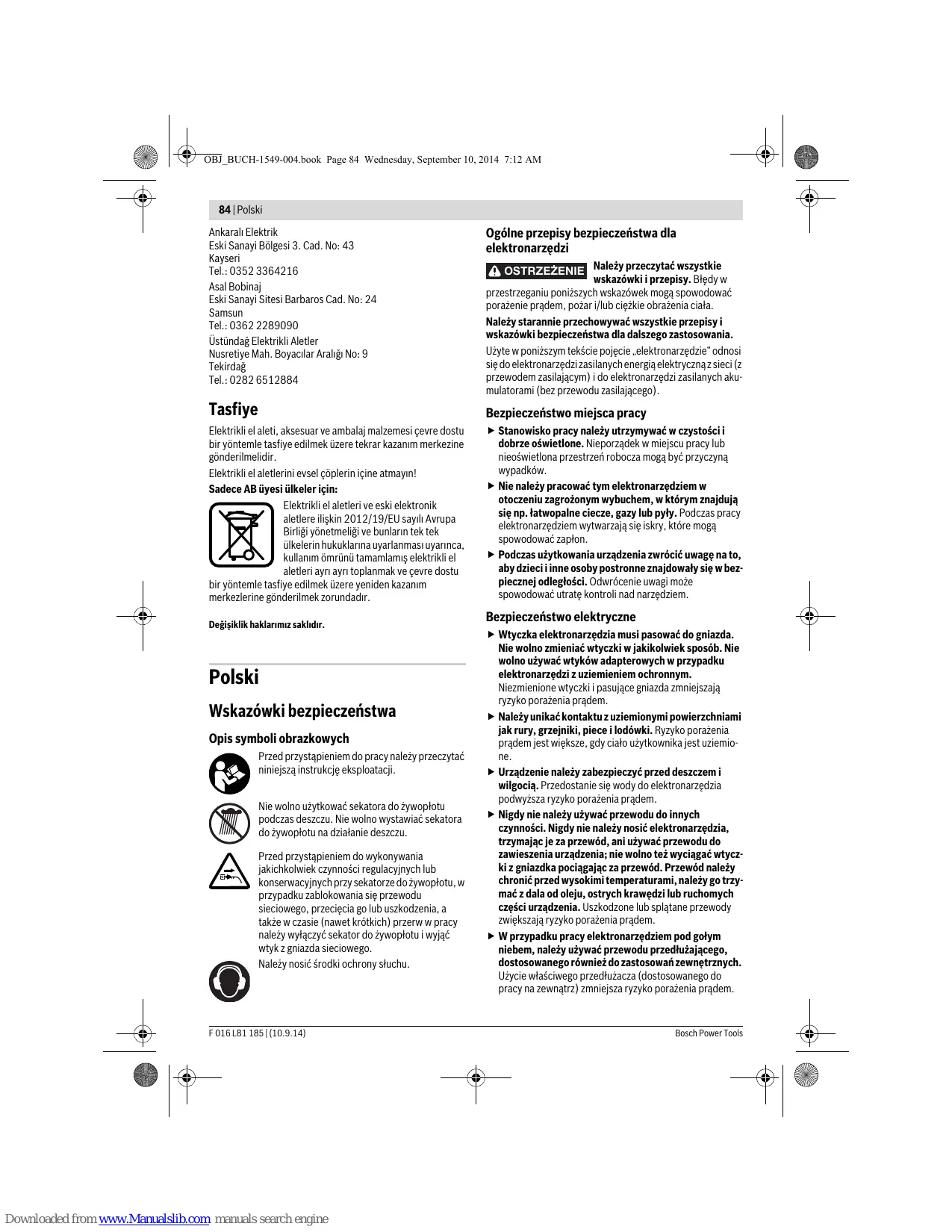 Denizli Tel.: 0258 2620666 Bosch Power Tools Downloaded from www.Manualslib.com manuals search engine Müşteri servisine başvurun Bulut Elektrik İstasyon Cad. No: 52/B Devlet Tiyatrosu Karşısı Elazığ Tel.: 0424 2183559 Körfez Elektrik Sanayi Çarşısı 770 Sok. No: 71 Erzincan Tel.: 0446 2230959 Ege Elektrik İnönü Bulvaro No: 135 Muğla Makasarası Fethiye Fethiye Tel.: 0252 6145701 Değer İş Bobinaj İsmetpaşa Mah. İlk Belediye Başkan Cad. 5/C Şahinbey Gaziantep Tel.: 0342 2316432 Çözüm Bobinaj İsmetpaşa Mah. Eski Şahinbey Belediyesi altı Cad. No: 3/C Gaziantep Tel.: 0342 2319500 Onarım Bobinaj Raifpaşa Cad. No: 67 İskenderun Hatay Tel.: 0326 6137546 Günşah Otomotiv Beylikdüzü Sanayi Sit. No: 210 Beylikdüzü İstanbul Tel.: 0212 8720066 Aygem 10021 Sok. No: 11 AOSB Çiğli İzmir Tel.: 0232 3768074 Sezmen Bobinaj Ege İş Merkezi 1201/4 Sok. No: 4/B Yenişehir İzmir Tel.: 0232 4571465 F 016 L81 185 | (10.9.14) OBJ_BUCH-1549-004.book Page 84 Wednesday, September 10, 2014 7:12 AM 84 | Polski Ankaralı Elektrik Eski Sanayi Bölgesi 3. Cad. No: 43 Kayseri Tel.: 0352 3364216 Asal Bobinaj Eski Sanayi Sitesi Barbaros Cad. No: 24 Samsun Tel.: 0362 2289090 Üstündağ Elektrikli Aletler Nusretiye Mah. Boyacılar Aralığı No: 9 Tekirdağ Tel.: 0282 6512884 Ogólne przepisy bezpieczeństwa dla elektronarzędzi Tasfiye Bezpieczeństwo miejsca pracy Elektrikli el aleti, aksesuar ve ambalaj malzemesi çevre dostu bir yöntemle tasfiye edilmek üzere tekrar kazanım merkezine gönderilmelidir. Elektrikli el aletlerini evsel çöplerin içine atmayın! Sadece AB üyesi ülkeler için: Elektrikli el aletleri ve eski elektronik aletlere ilişkin 2012/19/EU sayılı Avrupa Birliği yönetmeliği ve bunların tek tek ülkelerin hukuklarına uyarlanması uyarınca, kullanım ömrünü tamamlamış elektrikli el aletleri ayrı ayrı toplanmak ve çevre dostu bir yöntemle tasfiye edilmek üzere yeniden kazanım merkezlerine gönderilmek zorundadır. Stanowisko pracy należy utrzymywać w czystości i dobrze oświetlone. Nieporządek w miejscu pracy lub nieoświetlona przestrzeń robocza mogą być przyczyną wypadków. Nie należy pracować tym elektronarzędziem w otoczeniu zagrożonym wybuchem, w którym znajdują się np. łatwopalne ciecze, gazy lub pyły. Podczas pracy elektronarzędziem wytwarzają się iskry, które mogą spowodować zapłon. Podczas użytkowania urządzenia zwrócić uwagę na to, aby dzieci i inne osoby postronne znajdowały się w bezpiecznej odległości. Odwrócenie uwagi może spowodować utratę kontroli nad narzędziem. Değişiklik haklarımız saklıdır. Polski Wskazówki bezpieczeństwa Opis symboli obrazkowych Przed przystąpieniem do pracy należy przeczytać niniejszą instrukcję eksploatacji. Nie wolno użytkować sekatora do żywopłotu podczas deszczu. Nie wolno wystawiać sekatora do żywopłotu na działanie deszczu. Przed przystąpieniem do wykonywania jakichkolwiek czynności regulacyjnych lub konserwacyjnych przy sekatorze do żywopłotu, w przypadku zablokowania się przewodu sieciowego, przecięcia go lub uszkodzenia, a także w czasie (nawet krótkich) przerw w pracy należy wyłączyć sekator do żywopłotu i wyjąć wtyk z gniazda sieciowego. Należy nosić środki ochrony słuchu. F 016 L81 185 | (10.9.14) Downloaded from www.Manualslib.com manuals search engine OSTRZEZENIE Należy przeczytać wszystkie wskazówki i przepisy. Błędy w przestrzeganiu poniższych wskazówek mogą spowodować porażenie prądem, pożar i/lub ciężkie obrażenia ciała. Należy starannie przechowywać wszystkie przepisy i wskazówki bezpieczeństwa dla dalszego zastosowania. Użyte w poniższym tekście pojęcie „elektronarzędzie“ odnosi się do elektronarzędzi zasilanych energią elektryczną z sieci (z przewodem zasilającym) i do elektronarzędzi zasilanych akumulatorami (bez przewodu zasilającego). Bezpieczeństwo elektryczne Wtyczka elektronarzędzia musi pasować do gniazda. Nie wolno zmieniać wtyczki w jakikolwiek sposób. Nie wolno używać wtyków adapterowych w przypadku elektronarzędzi z uziemieniem ochronnym. Niezmienione wtyczki i pasujące gniazda zmniejszają ryzyko porażenia prądem. Należy unikać kontaktu z uziemionymi powierzchniami jak rury, grzejniki, piece i lodówki. Ryzyko porażenia prądem jest większe, gdy ciało użytkownika jest uziemione. Urządzenie należy zabezpieczyć przed deszczem i wilgocią. Przedostanie się wody do elektronarzędzia podwyższa ryzyko porażenia prądem. Nigdy nie należy używać przewodu do innych czynności. Nigdy nie należy nosić elektronarzędzia, trzymając je za przewód, ani używać przewodu do zawieszenia urządzenia; nie wolno też wyciągać wtyczki z gniazdka pociągając za przewód. Przewód należy chronić przed wysokimi temperaturami, należy go trzymać z dala od oleju, ostrych krawędzi lub ruchomych części urządzenia. Uszkodzone lub splątane przewody zwiększają ryzyko porażenia prądem. W przypadku pracy elektronarzędziem pod gołym niebem, należy używać przewodu przedłużającego, dostosowanego również do zastosowań zewnętrznych. Użycie właściwego przedłużacza (dostosowanego do pracy na zewnątrz) zmniejsza ryzyko porażenia prądem. Bosch Power Tools OBJ_BUCH-1549-004.book Page 85 Wednesday, September 10, 2014 7:12 AM Polski | 85 Jeżeli nie da się uniknąć zastosowania elektronarzędzia w wilgotnym otoczeniu, należy użyć wyłącznika ochronnego różnicowo-prądowego. Zastosowanie wyłącznika ochronnego różnicowo-prądowego zmniejsza ryzyko porażenia prądem. Bezpieczeństwo osób Podczas pracy z elektronarzędziem należy zachować ostrożność, każdą czynność wykonywać uważnie i z rozwagą. Nie należy używać elektronarzędzia, gdy jest się zmęczonym lub będąc pod wpływem narkotyków, alkoholu lub lekarstw. Moment nieuwagi przy użyciu elektronarzędzia może stać się przyczyną poważnych urazów