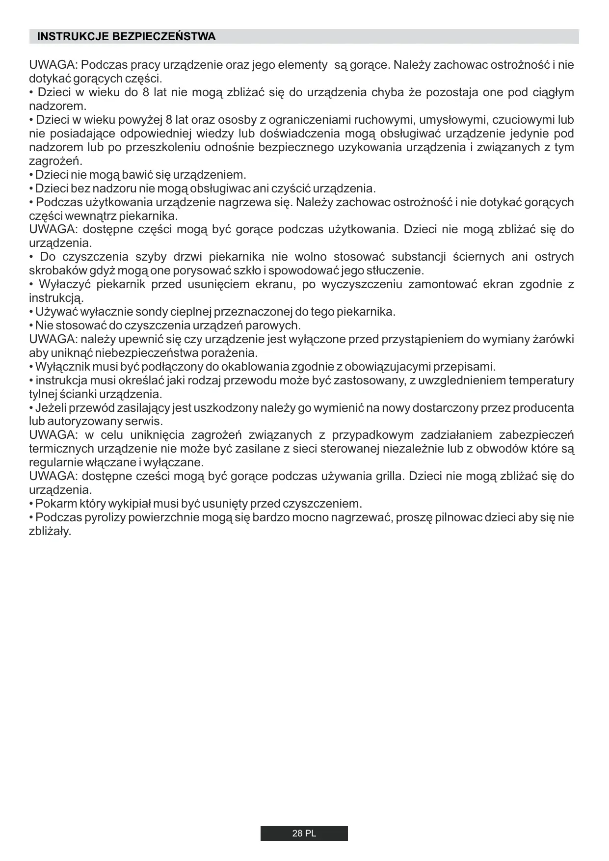 - Podczas pyrolizy powierzchnie mogą się bardzo mocno nagrzewać, proszę pilnowac dzieci aby się nie zbliżały. 28 PL
