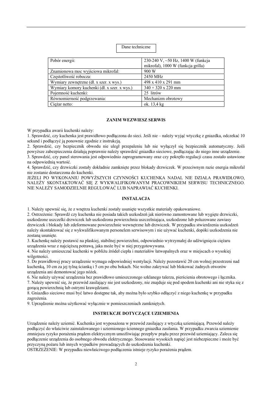 Przed przystapieniem do instalacji i uzytkowania kuchenki mikrofalowej nalewy dokladnie zapoznać sie z niniejsza instrukcja oblugi.