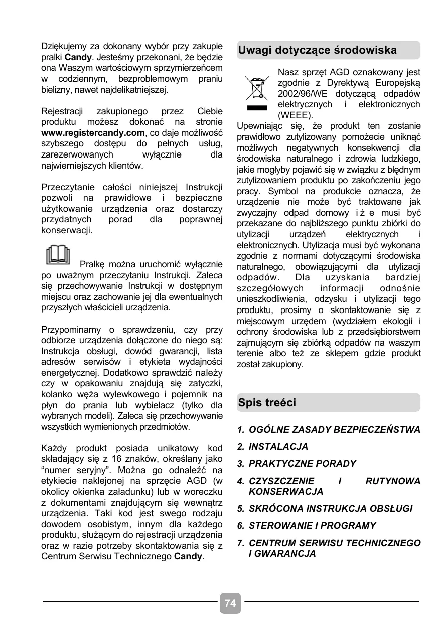 Dziękujemy za dokonany wybór przy zakupie pralki Candy. Jesteśmy przekonani, że będzie ona Waszym wartościowym sprzymierzeńcem w codziennym, bezproblemowym praniu bielizny, nawet najdelikatniejszej. Uwagi dotyczące środowiska Nasz sprzęt AGD oznakowany jest zgodnie z Dyrektywą Europejską 2002/96/WE dotyczącą odpadów elektrycznych i elektronicznych (WEEE). Upewniając się, że produkt ten zostanie prawidłowo zutylizowany pomożecie uniknąć możliwych negatywnych konsekwencji dla środowiska naturalnego i zdrowia ludzkiego, jakie mogłyby pojawić się w związku z błędnym zutylizowaniem produktu po zakończeniu jego pracy. Symbol na produkcie oznacza, że urządzenie nie może być traktowane jak zwyczajny odpad domowy i ż e musi być przekazane do najbliższego punktu zbiórki do utylizacji urządzeń elektrycznych elektronicznych. Utylizacja musi być wykonana zgodnie z normami dotyczącymi środowiska naturalnego, obowiązującymi dla utylizacji odpadów. Dla uzyskania bardziej szczegółowych informacji odnośnie unieszkodliwienia, odzysku i utylizacji tego produktu, prosimy o skontaktowanie się z miejscowym urzędem (wydziałem ekologii i ochrony środowiska lub z przedsiębiorstwem zajmującym się zbiórką odpadów na waszym terenie albo też ze sklepem gdzie produkt został zakupiony. Rejestracji zakupionego przez Ciebie produktu możesz dokonać na stronie www.registercandy.com, co daje możliwość szybszego dostępu do pełnych usług, zarezerwowanych wyłącznie dla najwierniejszych klientów. Przeczytanie całości niniejszej Instrukcji pozwoli na prawidłowe i bezpieczne użytkowanie urządzenia oraz dostarczy przydatnych porad dla poprawnej konserwacji. Pralkę można uruchomić wyłącznie po uważnym przeczytaniu Instrukcji. Zaleca się przechowywanie Instrukcji w dostępnym miejscu oraz zachowanie jej dla ewentualnych przyszłych właścicieli urządzenia. Przypominamy o sprawdzeniu, czy przy odbiorze urządzenia dołączone do niego są: Instrukcja obsługi, dowód gwarancji, lista adresów serwisów i etykieta wydajności energetycznej. Dodatkowo sprawdzić należy czy w opakowaniu znajdują się zatyczki, kolanko węża wylewkowego i pojemnik na płyn do prania lub wybielacz (tylko dla wybranych modeli). Zaleca się przechowywanie wszystkich wymienionych przedmiotów. Spis treéci