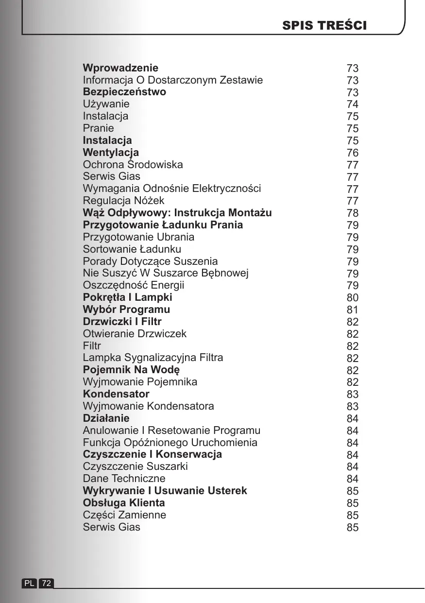 Wprowadzenie Informacja O Dostarczonym Zestawie Bezpieczeństwo Używanie Instalacja Pranie Instalacja Wentylacja Ochrona Środowiska Serwis Gias Wymagania Odnośnie Elektryczności Regulacja Nóżek Wąż Odpływowy: Instrukcja Montażu Przygotowanie Ładunku Prania Przygotowanie Ubrania Sortowanie Ładunku Porady Dotyczące Suszenia Nie Suszyć W Suszarce Bębnowej Oszczędność Energii Pokrętła I Lampki Wybór Programu Drzwiczki I Filtr Otwieranie Drzwiczek Filtr Lampka Sygnalizacyjna Filtra Pojemnik Na Wodę Wyjmowanie Pojemnika Kondensator Wyjmowanie Kondensatora Działanie Anulowanie I Resetowanie Programu Funkcja Opóźnionego Uruchomienia Czyszczenie I Konserwacja Czyszczenie Suszarki Dane Techniczne Wykrywanie I Usuwanie Usterek Obsługa Klienta Części Zamienne Serwis Gias PL 72