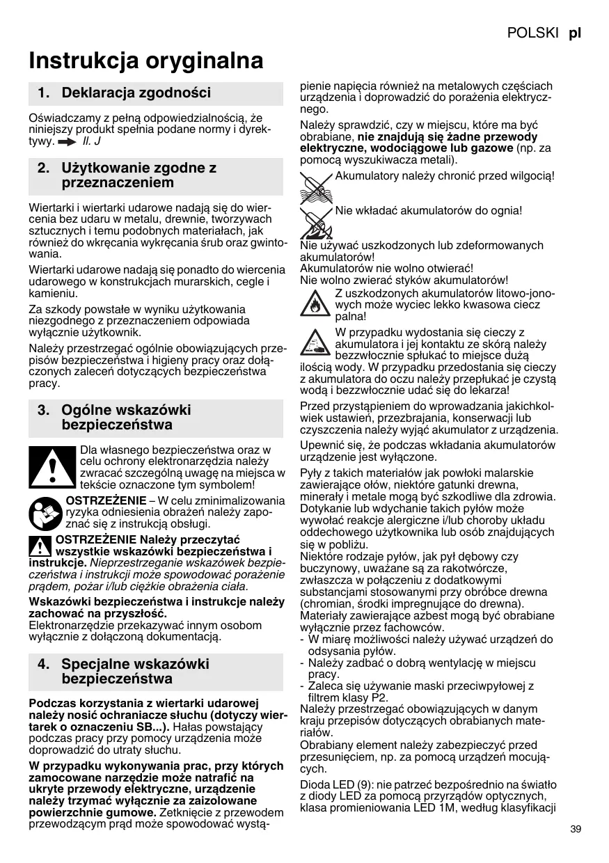 przeznaczeniem Wiertarki i wiertarki udarowe nadają się do wiercenia bez udaru w metalu, drewnie, tworzywach sztucznych i temu podobnych materiałach, jak również do wkręcania wykręcania śrub oraz gwintowania. Wiertarki udarowe nadają się ponadto do wiercenia udarowego w konstrukcjach murarskich, cegle i kamieniu. Za szkody powstałe w wyniku użytkowania niezgodnego z przeznaczeniem odpowiada wyłącznie użytkownik. Należy przestrzegać ogólnie obowiązujących przepisów bezpieczeństwa i higieny pracy oraz dołączonych zaleceń dotyczących bezpieczeństwa pracy.