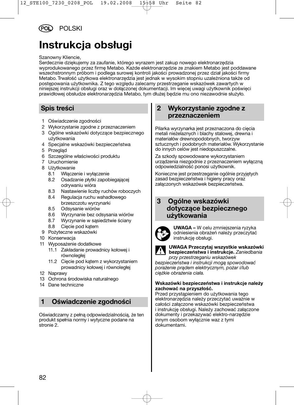 15:58 Uhr Seite 82 POLSKI Instrukcja obsługi Szanowny Kliencie, Serdecznie dziękujemy za zaufanie, którego wyrazem jest zakup nowego elektronarzędzia wyprodukowanego przez firmę Metabo. Każde elektronarzędzie ze znakiem Metabo jest poddawane wszechstronnym próbom i podlega surowej kontroli jakości prowadzonej przez dział jakości firmy Metabo. Trwałość użytkowa elektronarzędzia jest jednak w wysokim stopniu uzależniona także od postępowania użytkownika. Z tego względu zalecamy przestrzeganie wskazówek zawartych w niniejszej instrukcji obsługi oraz w dołączonej dokumentacji. Im więcej uwagi użytkownik poświęci prawidłowej obsłudze elektronarzędzia Metabo, tym dłużej będzie mu ono niezawodnie służyło. Spis treści 1 Oświadczenie zgodności 2 Wykorzystanie zgodne z przeznaczeniem 3 Ogólne wskazówki dotyczące bezpiecznego użytkowania 4 Specjalne wskazówki bezpieczeństwa 5 Przegląd 6 Szczególne właściwości produktu 7 Uruchomienie 8 Użytkowanie