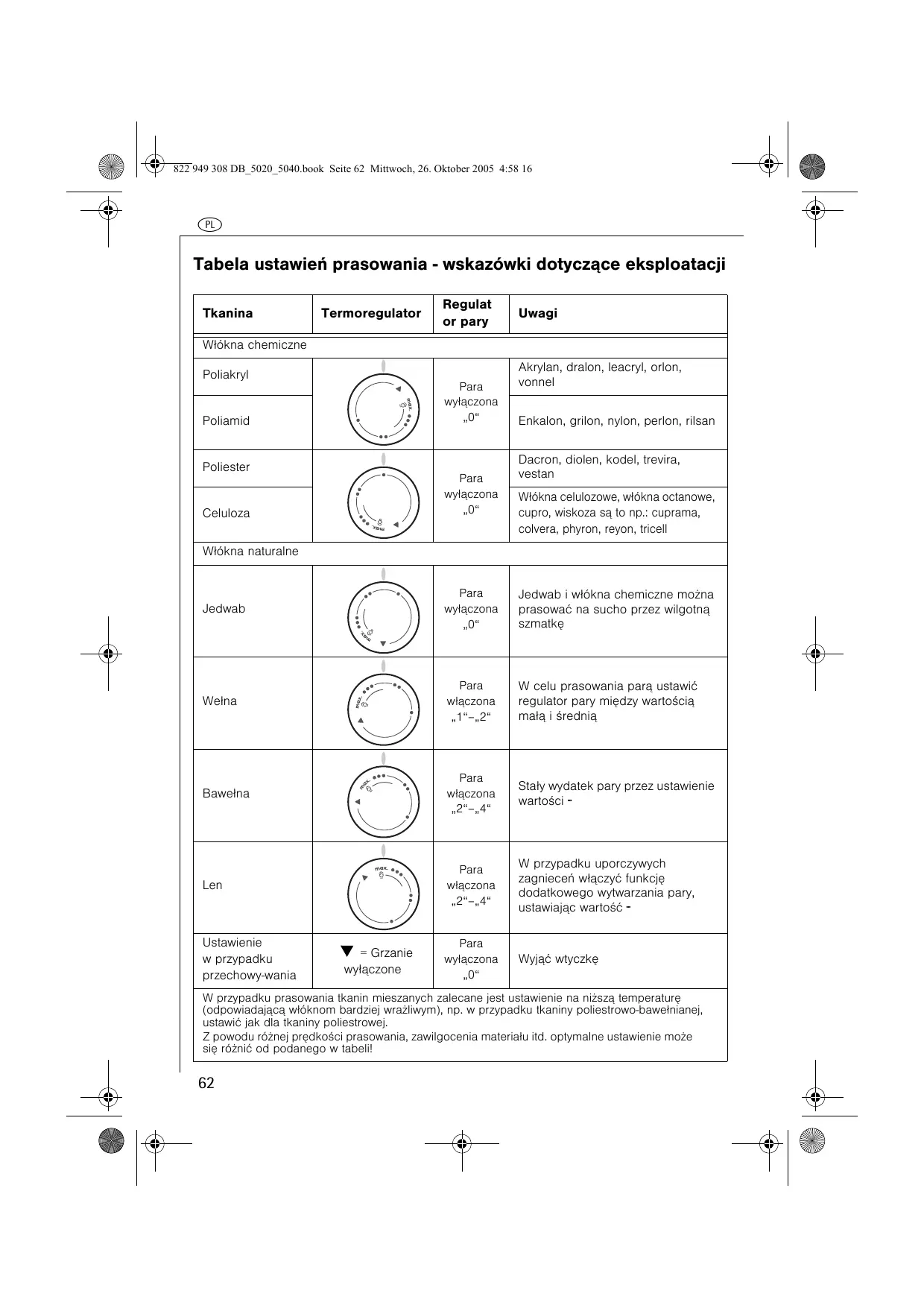Tabela ustawieñ prasowania - wskazówki dotycz¹ce eksploatacji Tkanina Termoregulator Regulat or pary Uwagi W³ókna chemiczne Poliakryl Para wy³¹czona „0“ Poliamid Poliester Para wy³¹czona „0“ Celuloza Akrylan, dralon, leacryl, orlon, vonnel Enkalon, grilon, nylon, perlon, rilsan Dacron, diolen, kodel, trevira, vestan W³ókna celulozowe, w³ókna octanowe, cupro, wiskoza s¹ to np.: cuprama, colvera, phyron, reyon, tricell W³ókna naturalne Jedwab Para wy³¹czona „0“ Jedwab i w³ókna chemiczne mo¿na prasowaæ na sucho przez wilgotn¹ szmatkê We³na Para w³¹czona „1“–„2“ W celu prasowania par¹ ustawiæ regulator pary miêdzy wartoœci¹ ma³¹ i œredni¹ Bawe³na Para w³¹czona „2“–„4“ Sta³y wydatek pary przez ustawienie wartoœci • • Len Para w³¹czona „2“–„4“ W przypadku uporczywych zagnieceñ w³¹czyæ funkcjê dodatkowego wytwarzania pary, ustawiaj¹c wartoœæ • • Para wy³¹czona „0“ Wyj¹æ wtyczkê Ustawienie w przypadku przechowy-wania = Grzanie wy³¹czone W przypadku prasowania tkanin mieszanych zalecane jest ustawienie na ni¿sz¹ temperaturê (odpowiadaj¹c¹ w³óknom bardziej wra¿liwym), np. w przypadku tkaniny poliestrowo-bawe³nianej, ustawiæ jak dla tkaniny poliestrowej. Z powodu ró¿nej prêdkoœci prasowania, zawilgocenia materia³u itd. optymalne ustawienie mo¿e siê ró¿niæ od podanego w tabeli!