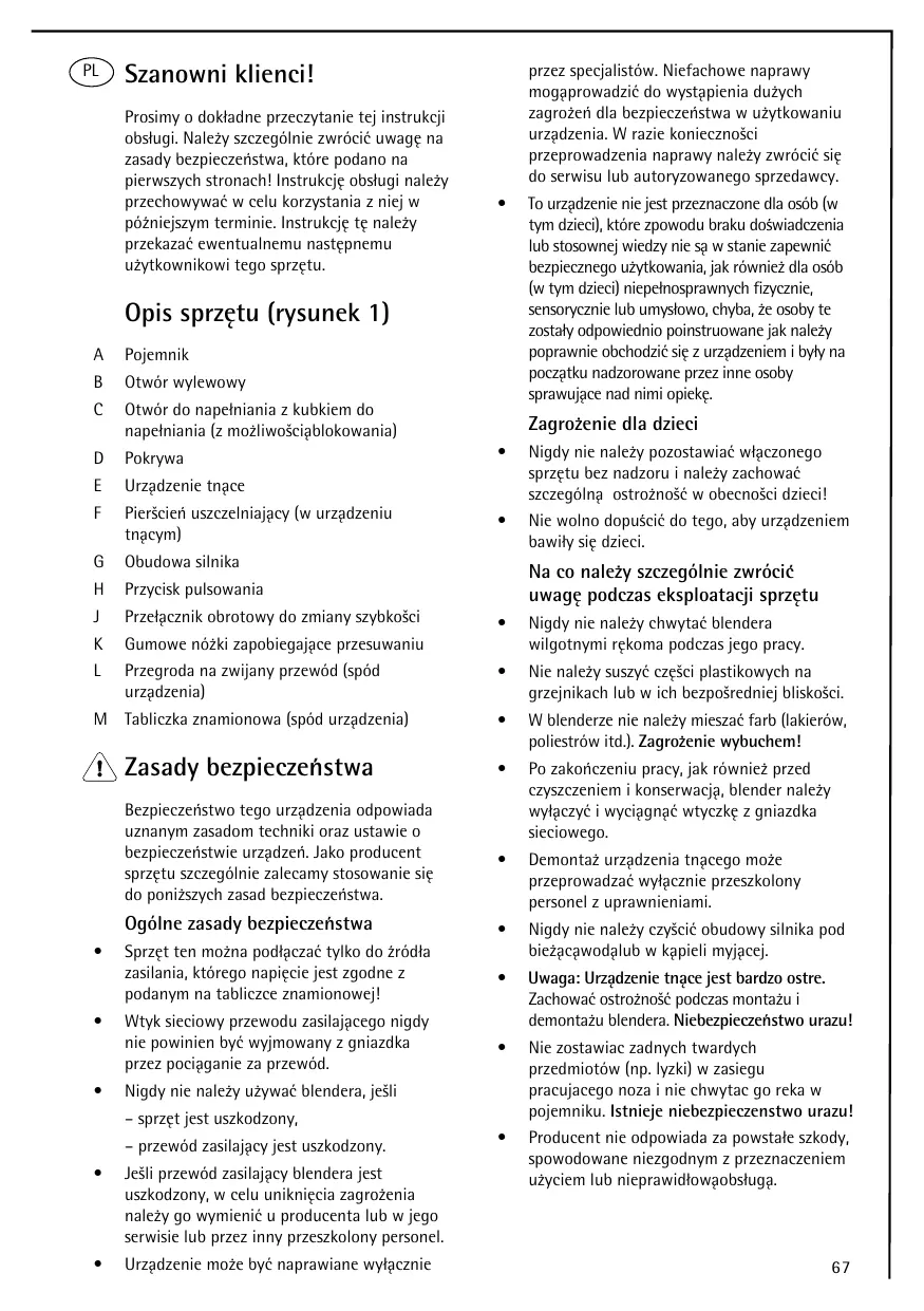 - Jesli przystawod zasilajczy blendera jest uszkodzony, w celuuniknięcia zagrozenia naleź go wymienc u producenta lub w是我的 serwisie lub przyżne przyszekolony personel.