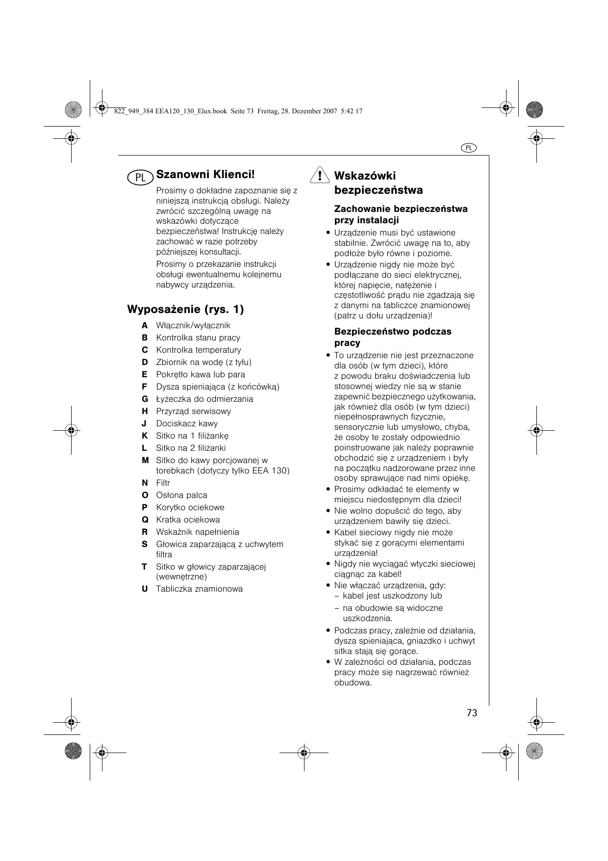 W³¹cznik/wy³¹cznik Kontrolka stanu pracy Kontrolka temperatury Zbiornik na wodê (z ty³u) Pokrêt³o kawa lub para Dysza spieniaj¹ca (z koñcówk¹) £y¿eczka do odmierzania Przyrz¹d serwisowy Dociskacz kawy Sitko na 1 fili¿ankê Sitko na 2 fili¿anki Sitko do kawy porcjowanej w torebkach (dotyczy tylko EEA 130) Filtr Os³ona palca Korytko ociekowe Kratka ociekowa WskaŸnik nape³nienia G³owica zaparzaj¹c¹ z uchwytem filtra Sitko w g³owicy zaparzaj¹cej (wewnêtrzne) Tabliczka znamionowa 1 Wskazówki bezpieczeñstwa Zachowanie bezpieczeñstwa przy instalacji