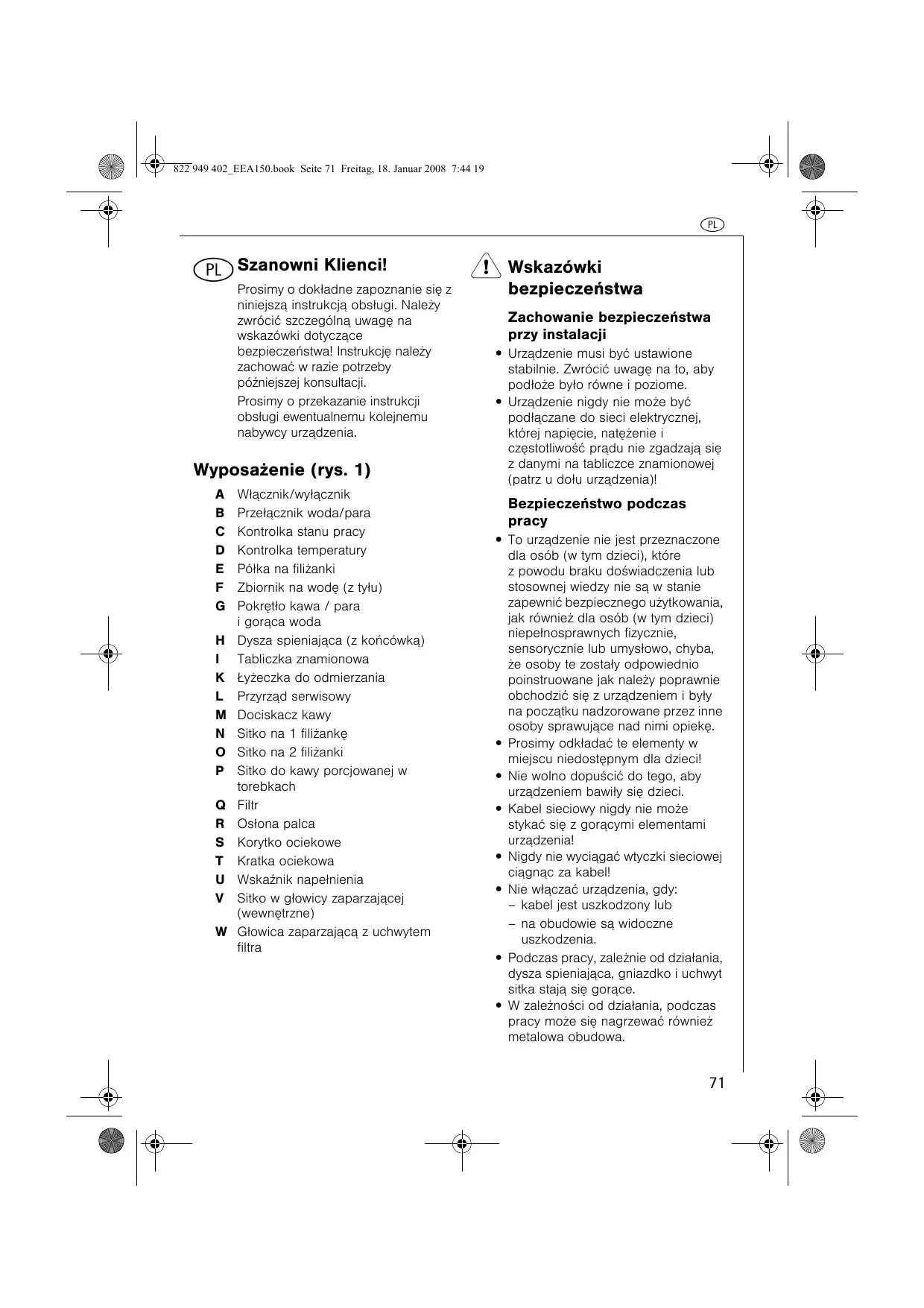 - podczas spieniania mleka powstaje za ma³o pianki: – U¿ywaæ zawsze œwie¿ego i ch³odnego mleka o ma³ej zawartoœci t³uszczu. – Wyczyœciæ dyszê spieniaj¹c¹. 822 949 402_EEA150.book Seite 77 Freitag, 18. Januar 2008 7:44 19