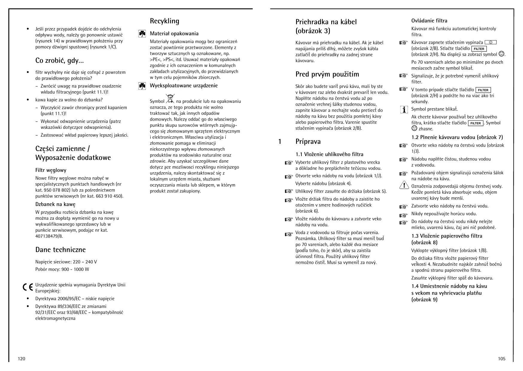 - k aw a k apie za w ol no do dzbank a? – W yczyścić zaw ór ch roniący prze d k apanie m (punk t 11.1)! – W yk onać odw apnie nie urządze nia (patrz w sk azów k i dotyczące odw apnie nia). – Z astosow ać w k ład papie row y l e psze j jak ości. Części zam ie nne / W yposaże nie dodatk ow e Fil tr w ęgl ow y Now e fil try w ęgl ow e m ożna nabyć w spe cjal istycznych punk tach h andl ow ych (nr k at. 9 50 078 802) l ub za pośre dnictw e m punk tów se rw isow ych (nr k at. 663 9 10 450). D zbane k na k aw ę W przypadk u rozbicia dzbank a na k aw ę m ożna za dopłatą w ym ie nić go na now y u w yk w al ifik ow ane go sprze daw cy l ub w punk cie se rw isow ym , podając nr k at. 407138479 /8. D ane te ch niczne Napięcie sie ciow e : 220 – 240 V Pobór m ocy: 9 00 - 1000 W Prie h radk a na k ábe l (obrázok 3) M ate riałopak ow ania M ate riały opak ow ania m ogą be z ogranicze ń zostać pow tórnie prze tw orzone . El e m e nty z tw orzyw sztucznych są oznak ow ane , np. > PE<, > PS<, itd. Usuw ać m ate riały opak ow ań zgodnie z ich oznacze nie m w k om unal nych zak ładach utyl izacyjnych , do prze w idzianych w tym ce l u poje m nik ów zbiorczych . K ávovar m á prie h radk u na k ábe l . Ak je k ábe l napájania príl iš dl h ý, m ôž e te zvyšok k ábl zatl ačiť do prie h radk y na zadne j strane k ávovaru. W ye k spl oatow ane urządze nie Sk ôr ak o bude te variť prvú k ávu, m al i by ste vk ávovare raz al e bo dvak rát pre variť l e n vodu. Napl ňte nádobu na če rstvú vodu až po označe nie vrch ne j šál k y stude nou vodou, zapnite k ávovar a ne ch ajte vodu pre tie cť do nádoby na k ávu be z použ itia pom l e te j k ávy e bo papie rovéh o fil tra. Vare nie spustíte stl ače ním vypínača (obrázok 2/B). Sym bol na produk cie l ub na opak ow aniu oznacza, ze te go produk tu nie w ol trak tow ać tak , jak innych odpadów dom ow ych . Nal e zy oddać go do w łasciw e go punk tu sk upu surow ców w tórnych zajm ujące go się złom ow anym sprzęte m e l e k trycznym i el e k tronicznym . W łasciw a utyl izacja i złom ow anie pom aga w e l im inacji nie k orzystne go w pływ u złom ow anych produk tów na srodow isk o natural ne oraz zdrow ie . Aby uzysk ać szcze gółow e dane dotycz ące m ozl iw osci re cyk l ingu ninie jsze go urządze nia, nal e zy sk ontak tow ać się z ok al nym urzęde m m iasta, słuzbam i oczyszczania m iasta l ub sk l e pe m , w k tórym produk t zostałzak upiony. Pre d prvým použitím