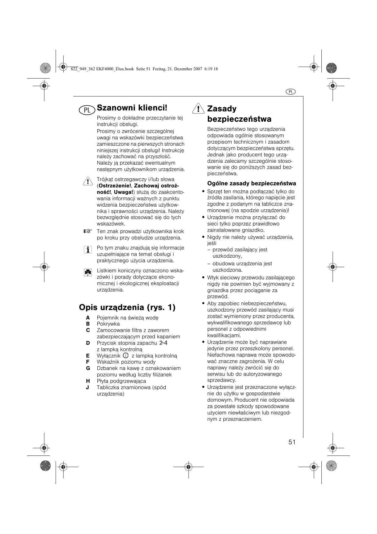Prosimy o dokladne przeczytanie tej instrukcji obstugi Prosimy o zwrécenie szczegôlnei uwagi na wskazéwki bezpieczeristwa zamieszczone na pienwszych stronach niniejszei instrukcji obslugil Instrukcje nalezy zachowaé na przyszlosé. Nalezy ja przekazaé ewentualnym nastepnym uéytkownikom urzadzenia. Tréjkat ostrzegawezy i/lub stowa (Ostrzezenie!, Zachowaj ostroz- no$é!, Uwagal) sluza do zaakcento- wania informacji waznych z punktu widzenia bezpieczeñstwa uytkow- nika i sprawnoéci urzadzenia. Nalezy bezwzglednie stosowaé sie do tych wskazéwek. Ten znak prowadzi uzytkownika krok po kroku przy obsludze urzadzenia. Po tym znaku znajduja sie informacje uzupelniajace na temat obslugi i praktycznego uiycia urzadzenia. Listkiem koniczyny oznaczono wska- zéwki i porady dotyczace ekono- micznej i ekologicznei eksploatacji urzadzenia. Opis urzadzenia (rys. 1) U ow> eT onm Pojemnik na éwieza wode Pokrywka Zamocowanie filtra z zaworem zabezpieczajacym przed kapaniem Przycisk stopnia zapachu 2-4 z lampka kontroina Wylacznik Oz lampka kontroina Wskaznik poziomu wody Dzbanek na kawe z oznakowaniem poziomu wedlug liczby fiizanek Plyta podarzewajaca Tabliczka znamionowa (spéd urzadzenia) A\ Zasady bezpieczenñstwa Bezpieczeñsiwo tego urzadzenia odpowiada ogélnie stosowanym przepisom technicznym i zasadom dotyczacym bezpieczeñstwa sprzetu. Jednak jako producent tego urza- dzenia zalecamy szczegôinie stoso- wanie sie do ponizszych zasad bez- pieczerstwa. Ogôlne zasady bezpieczeñstwa Sprzet ten moëna podiaczaé tylko do Zr6dia zasilania, ktérego napiecie jest 2godne z podanym na tabliczce zna- mionowei (na spodzie urzadzenia)! Urzadzenie mozna przytaczaé do sieci tylko poprzez prawidiowo zainstalowane gniazdko. Nigdy nie nalezy uzywaé urzadzenia, jesli — przewéd zasilajacy jest uszkodzony, — obudowa urzadzenia jest uszkodzona. Wtyk sieciowy przewodu zasilajacego nigdy nie powinien byé wyimowany z gniazdka przez pociaganie za przewéd. Aby zapobiec niebezpieczeristwu, uszkodzony przewéd zasilajacy musi zostaé wymieniony przez producenta, wykwalifikowanego sprzedawce lub personel z odpowiednimi kwalifikacjami Urzadzenie moze byé naprawiane jedynie przez przeszkolony personel Niefachowa naprawa moze spowodo- waé znaczne zagrozenia. W celu naprawy nalezy zwrôcié sie do serwisu lub do autoryzowanego sprzedawcy. Urzadzenie jest przeznaczone wylacz- nie do uzytku w gospodarstwie domowym. Producent nie odpowiada za powstale szkody spowodowane uzyciem niewlaéciwym lub niezgod- nym z przeznaczeniem