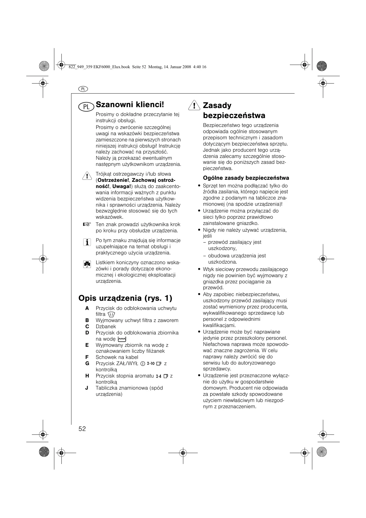 - Urz¹dzenie jest przeznaczone wy³¹cznie do u¿ytku w gospodarstwie domowym. Producent nie odpowiada za powsta³e szkody spowodowane u¿yciem niew³aœciwym lub niezgodnym z przeznaczeniem. 822_949_359 EKF6000_Elux.book Seite 53 Montag, 14. Januar 2008 4:40 16