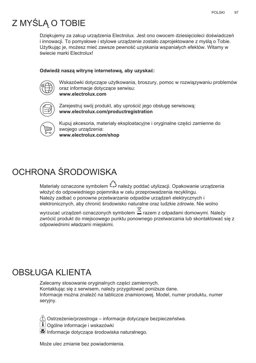 Z MY$LA O TOBIE Dziekujemy za zakup urzadzenia Electrolux. Jest ono owocem dziesiecioleci doéwiadczeri i innowacii. To pomyslowe i stylowe urzadzenie zostalo zaprojektowane z my$la o Tobie. Uytkujac je, mozesz mieé zawsze pewnoéé uzyskania wspaniatych efektôw. Witamy w éwiecie marki Electrolux!