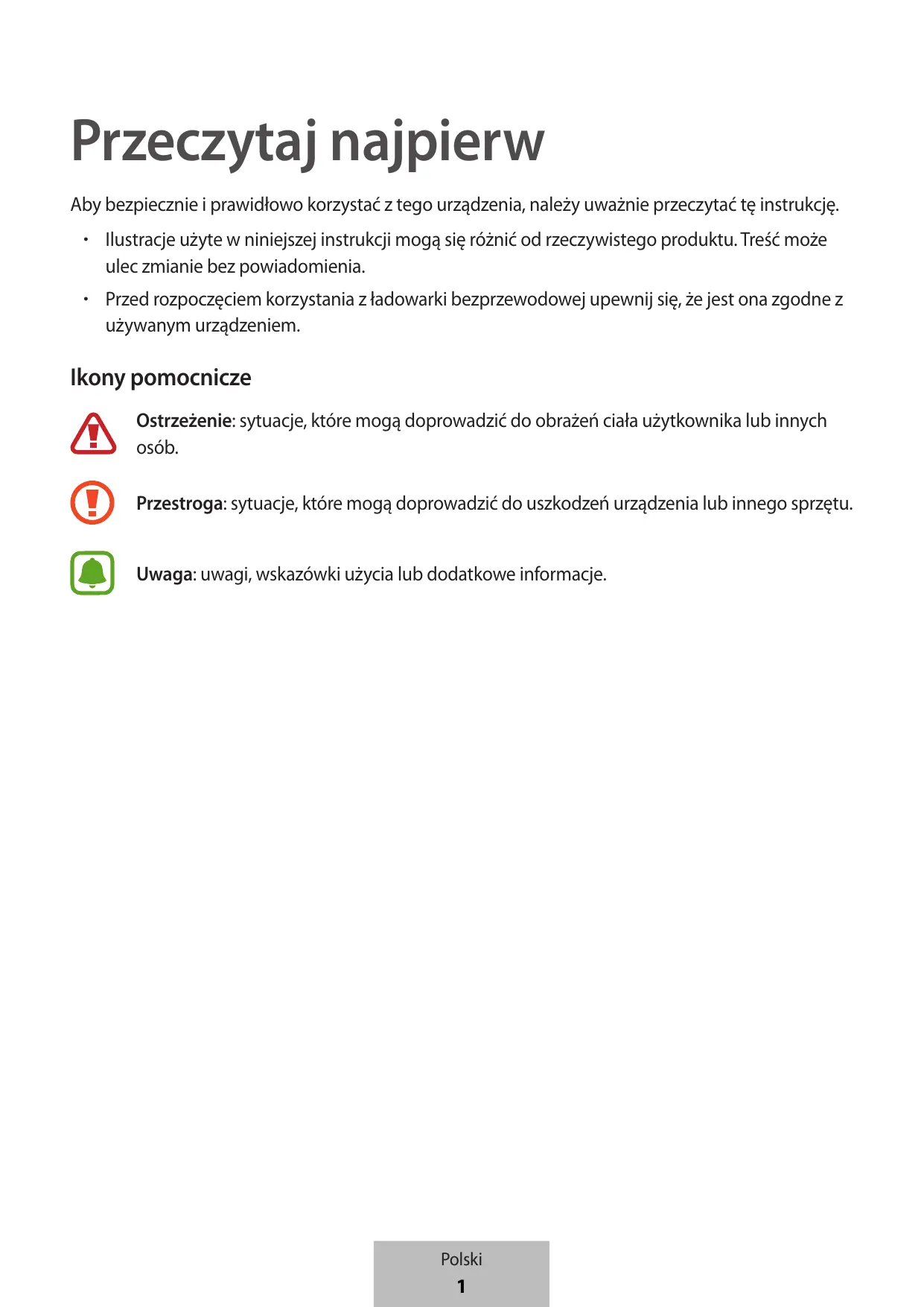 - Przed rozpoczęciem korzystania z ładowarki bezprzewodowej upewnij się, że jest ona zgodne z używanym urządzeniem. Ikony pomocnicze Ostrzeżenie: sytuacje, które mogą doprowadzić do obrażeń ciała użytkownika lub innych osób. Przestroga: sytuacje, które mogą doprowadzić do uszkodzeń urządzenia lub innego sprzętu. Uwaga: uwagi, wskazówki użycia lub dodatkowe informacje. Polski