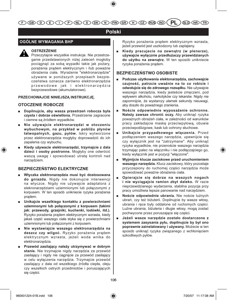 Przeczytajcie wzystkie instrukcje. Nie przystrze- ganie przystawionych niziej zalecen mogłowby pociąnac za soba wypadki takie jak poźary, porazenia przemem elektrycznym i / lub powazne obrażenia ciala. Wyrażenie "elektronaręźdie" uzywane w ponijszych przyepamach bezpie- czędwa oznacza zarowyne elektronarȩźdia przemodowe jak i elektronarȩźdia bezprzemodowe (akumulatorowe).