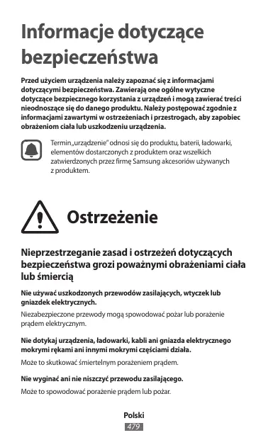 Informacje dotyczące bezpieczeństwa Przed użyciem urządzenia należy zapoznać się z informacjami dotyczącymi bezpieczeństwa. Zawierają one ogólne wytyczne dotyczące bezpiecznego korzystania z urządzeń i mogą zawierać treści nieodnoszące się do danego produktu. Należy postępować zgodnie z informacjami zawartymi w ostrzeżeniach i przestrogach, aby zapobiec obrażeniom ciała lub uszkodzeniu urządzenia. Termin „urządzenie” odnosi się do produktu, baterii, ładowarki, elementów dostarczonych z produktem oraz wszelkich zatwierdzonych przez firmę Samsung akcesoriów używanych z produktem. Ostrzeżenie Nieprzestrzeganie zasad i ostrzeżeń dotyczących bezpieczeństwa grozi poważnymi obrażeniami ciała lub śmiercią Nie używać uszkodzonych przewodów zasilających, wtyczek lub gniazdek elektrycznych. Niezabezpieczone przewody mogą spowodować pożar lub porażenie prądem elektrycznym. Nie dotykaj urządzenia, ładowarki, kabli ani gniazda elektrycznego mokrymi rękami ani innymi mokrymi częściami działa. Może to skutkować śmiertelnym porażeniem prądem. Nie wyginać ani nie niszczyć przewodu zasilającego. Może to spowodować porażenie prądem lub pożar. Polski