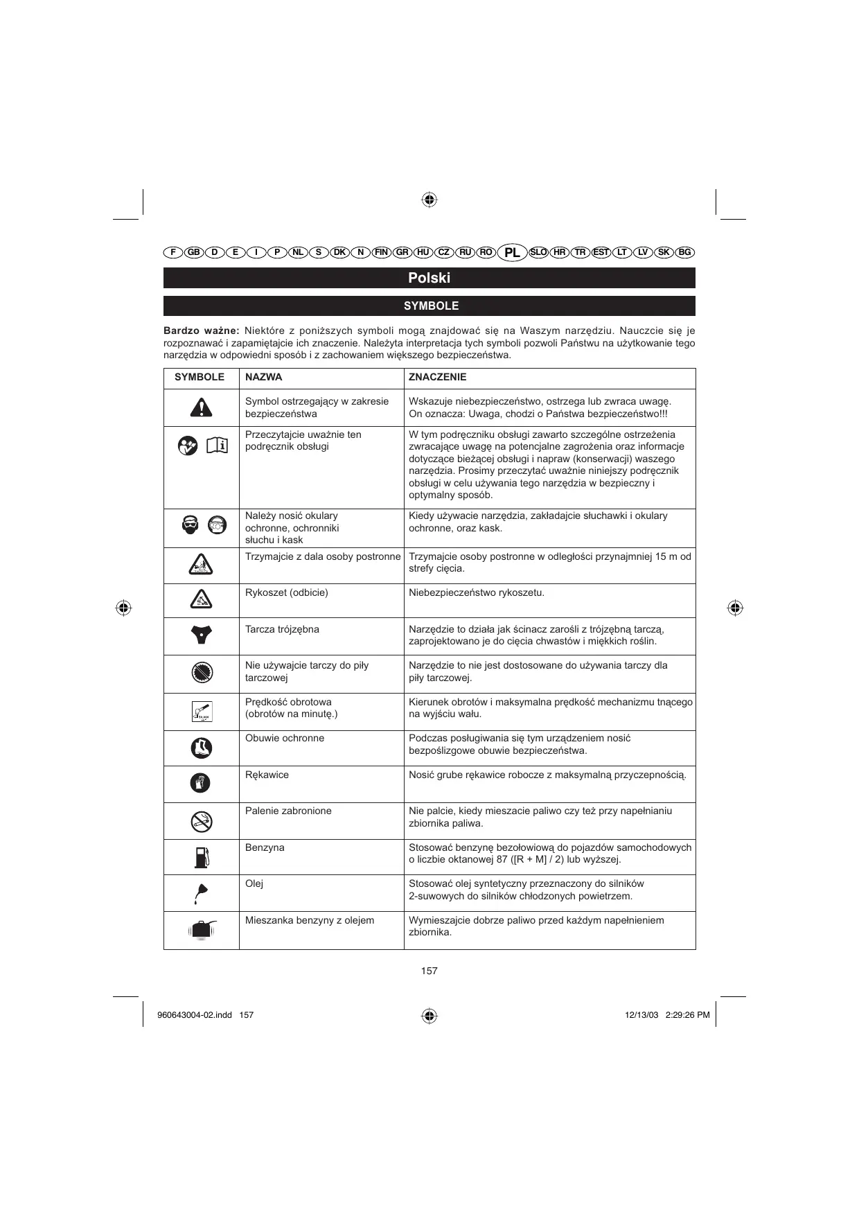 Polski SYMBOLE Bardzo ważne: Niektóre z poniższych symboli mogą znajdować się na Waszym narzędziu. Nauczcie się je rozpoznawać i zapamiętajcie ich znaczenie. Należyta interpretacja tych symboli pozwoli Państwu na użytkowanie tego narzędzia w odpowiedni sposób i z zachowaniem większego bezpieczeństwa. SYMBOLE NAZWA ZNACZENIE Symbol ostrzegający w zakresie bezpieczeństwa Wskazuje niebezpieczeństwo, ostrzega lub zwraca uwagę. On oznacza: Uwaga, chodzi o Państwa bezpieczeństwo!!! Przeczytajcie uważnie ten podręcznik obsługi W tym podręczniku obsługi zawarto szczególne ostrzeżenia zwracające uwagę na potencjalne zagrożenia oraz informacje dotyczące bieżącej obsługi i napraw (konserwacji) waszego narzędzia. Prosimy przeczytać uważnie niniejszy podręcznik obsługi w celu używania tego narzędzia w bezpieczny i optymalny sposób. Należy nosić okulary ochronne, ochronniki słuchu i kask Kiedy używacie narzędzia, zakładajcie słuchawki i okulary ochronne, oraz kask. Trzymajcie z dala osoby postronne Trzymajcie osoby postronne w odległości przynajmniej 15 m od strefy cięcia. Rykoszet (odbicie) Niebezpieczeństwo rykoszetu. Tarcza trójzębna Narzędzie to działa jak ścinacz zarośli z trójzębną tarczą, zaprojektowano je do cięcia chwastów i miękkich roślin. Nie używajcie tarczy do piły tarczowej Narzędzie to nie jest dostosowane do używania tarczy dla piły tarczowej. Prędkość obrotowa (obrotów na minutę.) Kierunek obrotów i maksymalna prędkość mechanizmu tnącego na wyjściu wału. Obuwie ochronne Podczas posługiwania się tym urządzeniem nosić bezpoślizgowe obuwie bezpieczeństwa. Rękawice Nosić grube rękawice robocze z maksymalną przyczepnością. Palenie zabronione Nie palcie, kiedy mieszacie paliwo czy też przy napełnianiu zbiornika paliwa. Benzyna Stosować benzynę bezołowiową do pojazdów samochodowych o liczbie oktanowej 87 ([R + M] / 2) lub wyższej. Olej Stosować olej syntetyczny przeznaczony do silników 2-suwowych do silników chłodzonych powietrzem. Mieszanka benzyny z olejem Wymieszajcie dobrze paliwo przed każdym napełnieniem zbiornika.