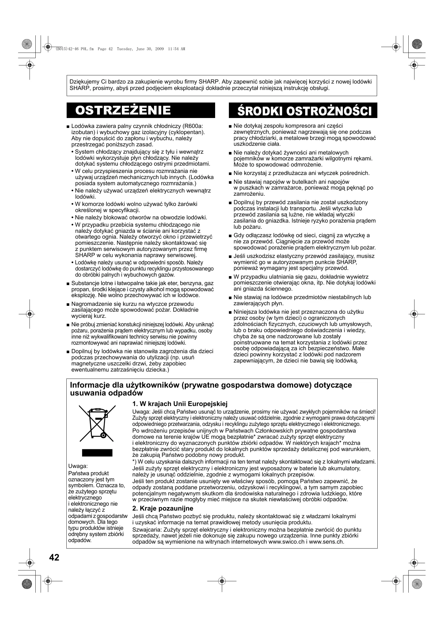 (B015)42-46 POL.fm Page 42 Tuesday, June 30, 2009 11:54 AM Dziękujemy Ci bardzo za zakupienie wyrobu firmy SHARP. Aby zapewnić sobie jak najwięcej korzyści z nowej lodówki SHARP, prosimy, abyś przed podjęciem eksploatacji dokładnie przeczytał niniejszą instrukcję obsługi. OSTRZEŻENIE