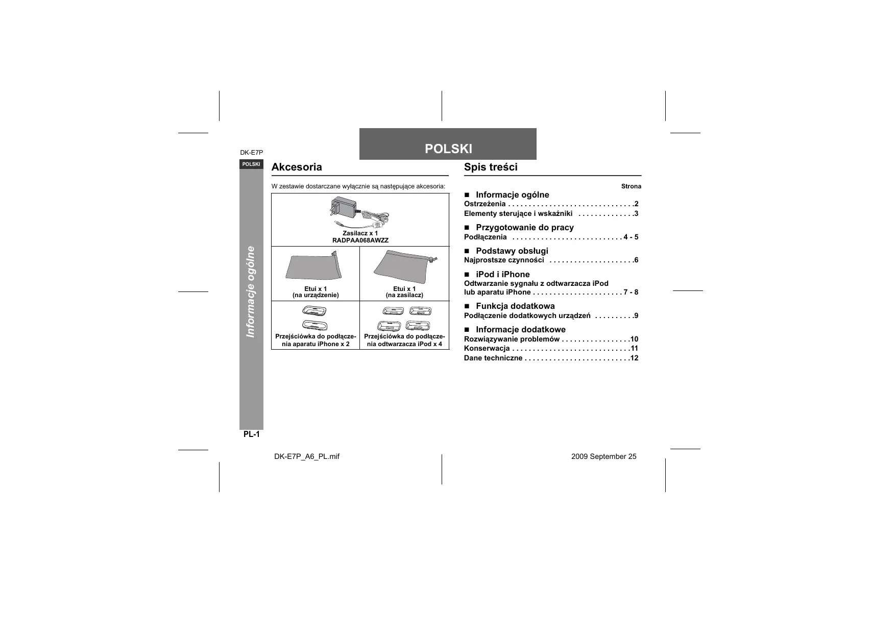 Ra eazz Ext ext (ra Een) lle prajiaéute da poque. | Prajééee 8e pacs. a nee | nn one DK-E7P_A6_PL.mif = Informacje ogôlne Ostrzezenia Elementy sterujace i wskaniki = Przygotowanie do pracy Podiaczenia .… = Podstawy obstugi Najprostsze czynnoéci “iPod i iPhone Odtwarzanie sygnalu z odtwarzacza iPod lub aparatu iPhone = Funkcja dodatkowa Podtaczenie dodatkowych urzadzeñ 9 m_Informacje dodatkowe Rozwiazywanie probleméôw . Konserwaci; Dane techniczne . 2009 September 25