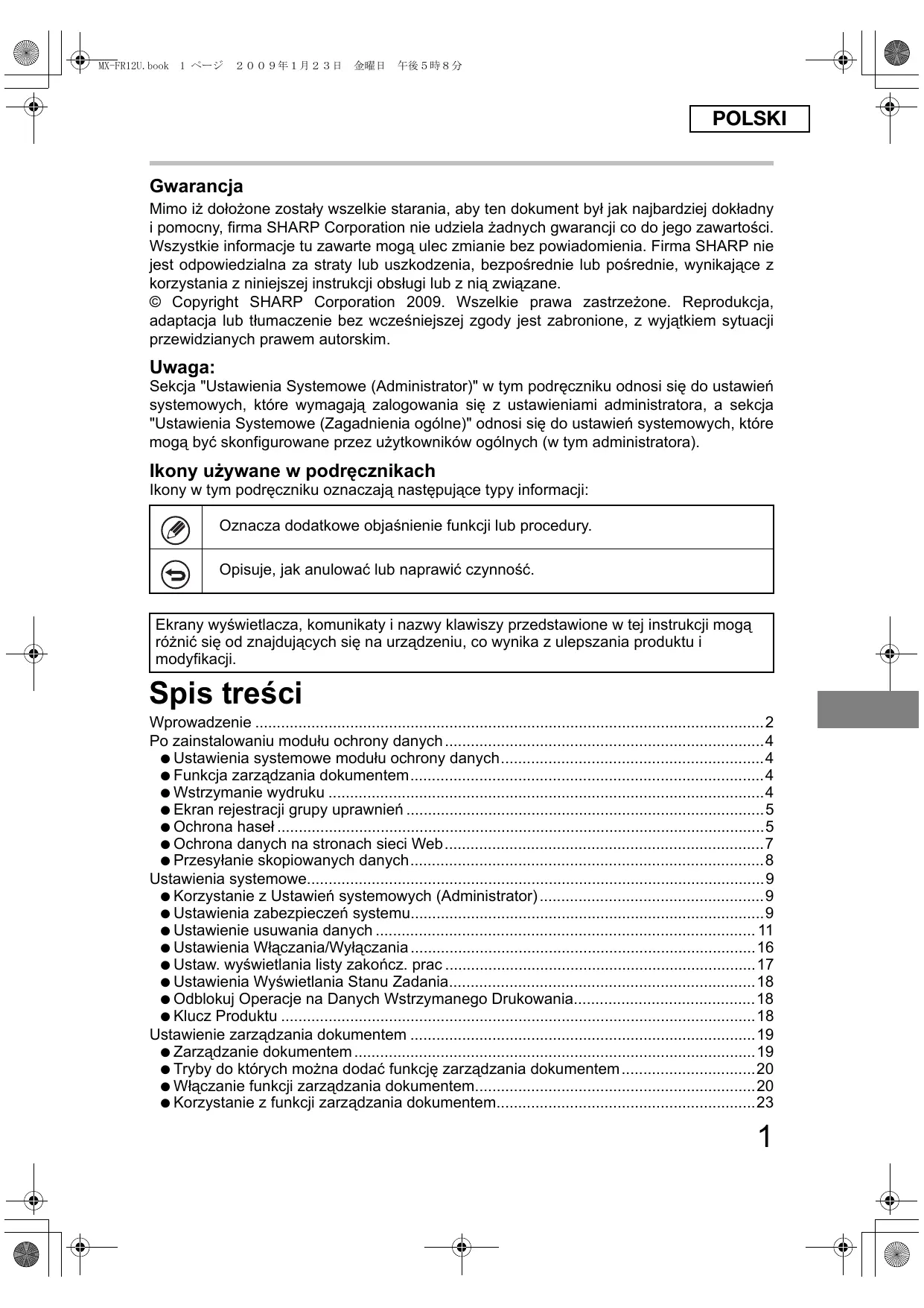- POLSKI Gwarancja Mimo iż dołożone zostały wszelkie starania, aby ten dokument był jak najbardziej dokładny i pomocny, firma SHARP Corporation nie udziela żadnych gwarancji co do jego zawartości. Wszystkie informacje tu zawarte mogą ulec zmianie bez powiadomienia. Firma SHARP nie jest odpowiedzialna za straty lub uszkodzenia, bezpośrednie lub pośrednie, wynikające z korzystania z niniejszej instrukcji obsługi lub z nią związane. © Copyright SHARP Corporation 2009. Wszelkie prawa zastrzeżone. Reprodukcja, adaptacja lub tłumaczenie bez wcześniejszej zgody jest zabronione, z wyjątkiem sytuacji przewidzianych prawem autorskim. Uwaga: Sekcja "Ustawienia Systemowe (Administrator)" w tym podręczniku odnosi się do ustawień systemowych, które wymagają zalogowania się z ustawieniami administratora, a sekcja "Ustawienia Systemowe (Zagadnienia ogólne)" odnosi się do ustawień systemowych, które mogą być skonfigurowane przez użytkowników ogólnych (w tym administratora). Ikony używane w podręcznikach Ikony w tym podręczniku oznaczają następujące typy informacji: Oznacza dodatkowe objaśnienie funkcji lub procedury. Opisuje, jak anulować lub naprawić czynność. Ekrany wyświetlacza, komunikaty i nazwy klawiszy przedstawione w tej instrukcji mogą różnić się od znajdujących się na urządzeniu, co wynika z ulepszania produktu i modyfikacji. Spis treści Wprowadzenie p. 2
