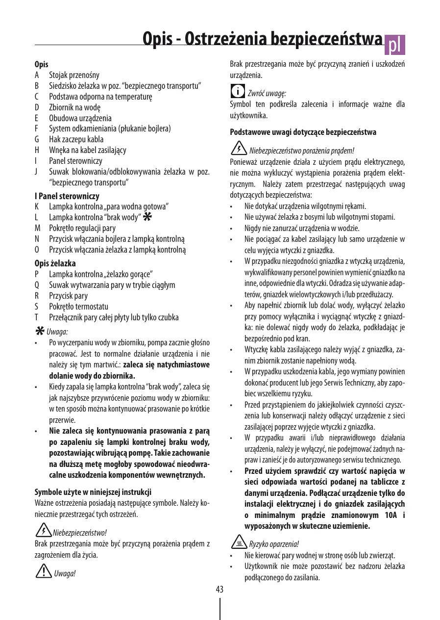 Opis - Ostrzeżenia bezpieczeństwa pl Brak przestrzegania może być przyczyną zranień i uszkodzeń urządzenia. Opis A Stojak przenośny B Siedzisko żelazka w poz. “bezpiecznego transportu” C Podstawa odporna na temperaturę D Zbiornik na wodę E Obudowa urządzenia F System odkamieniania (płukanie bojlera) G Hak zaczepu kabla H Wnęka na kabel zasilający I Panel sterowniczy J Suwak blokowania/odblokowywania żelazka w poz. “bezpiecznego transportu” I Panel sterowniczy K Lampka kontrolna „para wodna gotowa” L Lampka kontrolna “brak wody” M Pokrętło regulacji pary N Przycisk włączania bojlera z lampką kontrolną O Przycisk włączania żelazka z lampką kontrolną Opis żelazka P Lampka kontrolna „żelazko gorące” Q Suwak wytwarzania pary w trybie ciągłym R Przycisk pary S Pokrętło termostatu T Przełącznik pary całej płyty lub tylko czubka Zwróć uwagę: Symbol ten podkreśla zalecenia i informacje ważne dla użytkownika. Podstawowe uwagi dotyczące bezpieczeństwa Niebezpieczeństwo porażenia prądem! Ponieważ urządzenie działa z użyciem prądu elektrycznego, nie można wykluczyć wystąpienia porażenia prądem elektrycznym. Należy zatem przestrzegać następujących uwag dotyczących bezpieczeństwa: