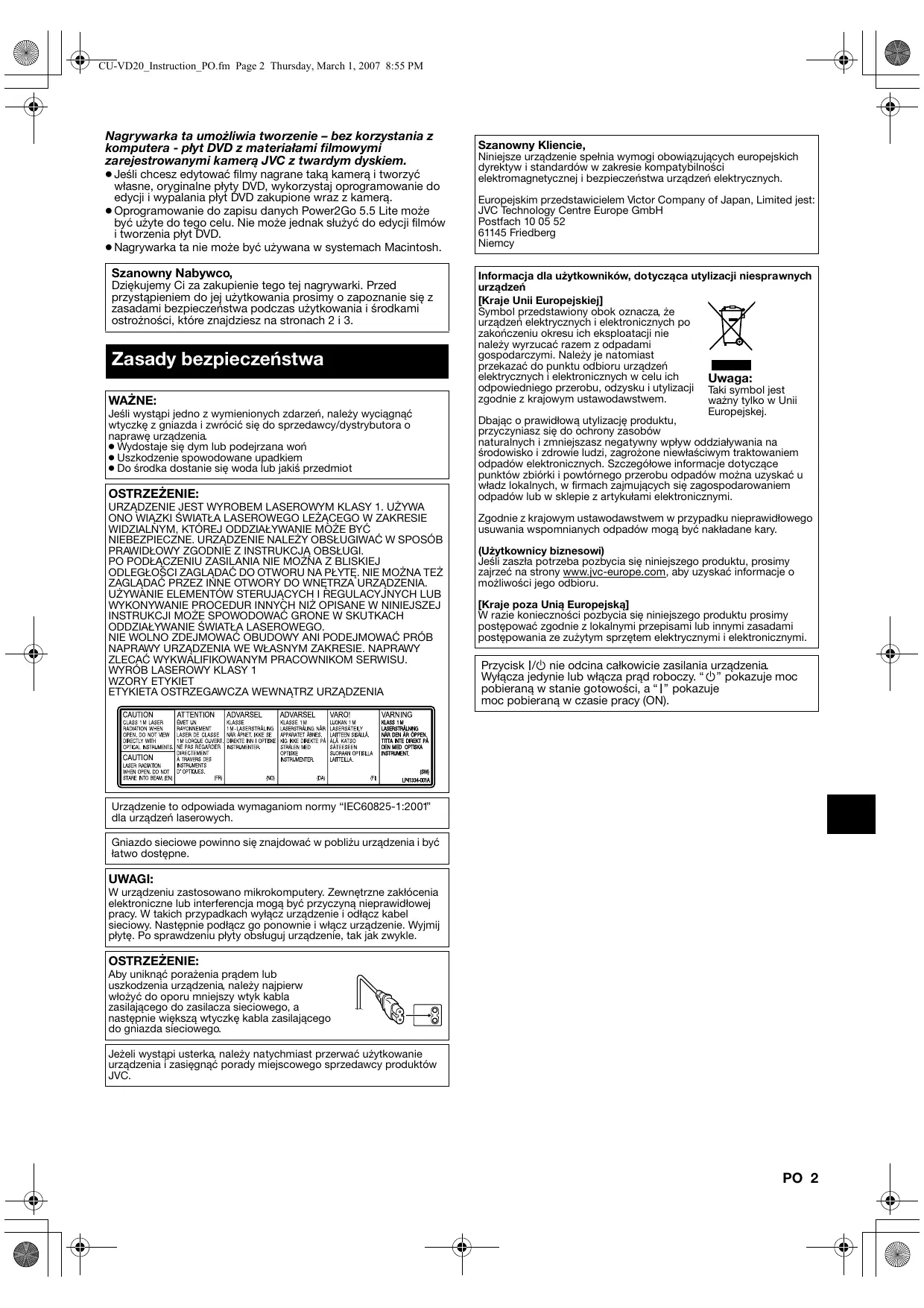 8 ČE CU-VD20_Instruction_PO.fm Page 2 Thursday, March 1, 2007 8:55 PM Nagrywarka ta umożliwia tworzenie – bez korzystania z komputera - płyt DVD z materiałami filmowymi zarejestrowanymi kamerą JVC z twardym dyskiem. ● Jeśli chcesz edytować filmy nagrane taką kamerą i tworzyć własne, oryginalne płyty DVD, wykorzystaj oprogramowanie do edycji i wypalania płyt DVD zakupione wraz z kamerą. ● Oprogramowanie do zapisu danych Power2Go 5.5 Lite może być użyte do tego celu. Nie może jednak służyć do edycji filmów i tworzenia płyt DVD. ● Nagrywarka ta nie może być używana w systemach Macintosh.