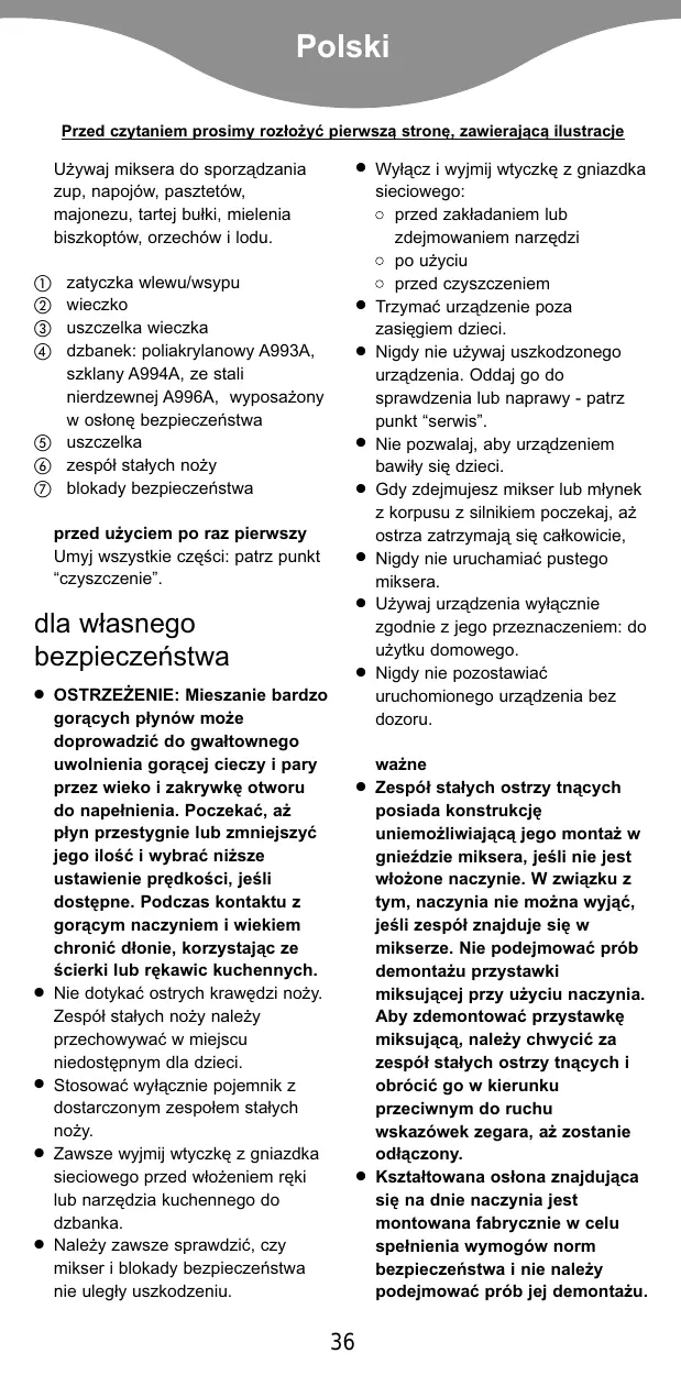 OSTRZEŻENIE: Mieszanie bardzo gorących płynów może doprowadzić do gwałtownego uwolnienia gorącej cieczy i pary przez wieko i zakrywkę otworu do napełnienia. Poczekać, aż płyn przestygnie lub zmniejszyć jego ilość i wybrać niższe ustawienie prędkości, jeśli dostępne. Podczas kontaktu z gorącym naczyniem i wiekiem chronić dłonie, korzystając ze ścierki lub rękawic kuchennych. Nie dotykać ostrych krawędzi noży. Zespół stałych noży należy przechowywać w miejscu niedostępnym dla dzieci. Stosować wyłącznie pojemnik z dostarczonym zespołem stałych noży. Zawsze wyjmij wtyczkë z gniazdka sieciowego przed w¢o¯eniem rëki lub narzëdzia kuchennego do dzbanka. Nale¯y zawsze sprawdziç, czy mikser i blokady bezpieczeæstwa nie uleg¢y uszkodzeniu.