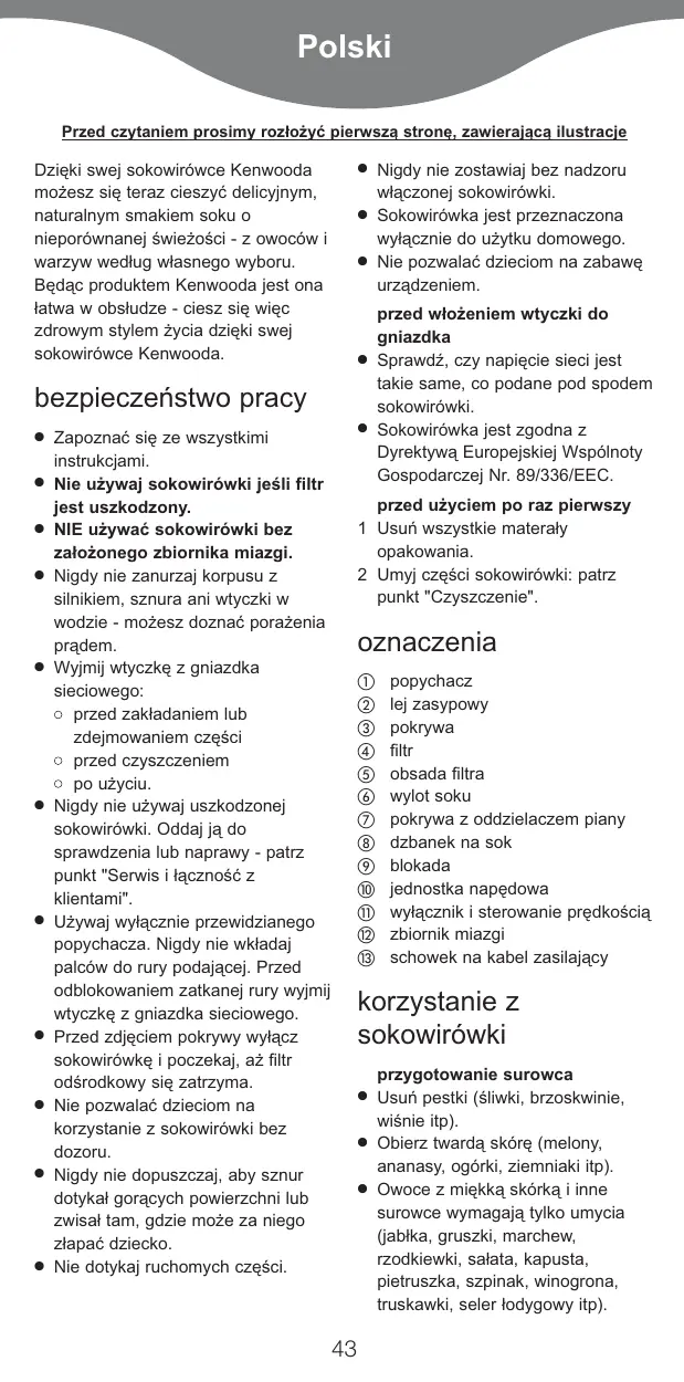 Zapoznać się ze wszystkimi instrukcjami. Nie u¯ywaj sokowirówki jeÿli filtr jest uszkodzony. NIE używać sokowirówki bez założonego zbiornika miazgi. Nigdy nie zanurzaj korpusu z silnikiem, sznura ani wtyczki w wodzie - mo¯esz doznaç pora¯enia prådem. Wyjmij wtyczkë z gniazdka sieciowego: ● przed zak¢adaniem lub zdejmowaniem czëÿci ● przed czyszczeniem ● po u¯yciu. Nigdy nie u¯ywaj uszkodzonej sokowirówki. Oddaj jå do sprawdzenia lub naprawy - patrz punkt "Serwis i ¢åcznoÿç z klientami". U¯ywaj wy¢åcznie przewidzianego popychacza. Nigdy nie wk¢adaj palców do rury podajåcej. Przed odblokowaniem zatkanej rury wyjmij wtyczkë z gniazdka sieciowego. Przed zdjëciem pokrywy wy¢åcz sokowirówkë i poczekaj, a¯ filtr odÿrodkowy sië zatrzyma. Nie pozwalać dzieciom na korzystanie z sokowirówki bez dozoru. Nigdy nie dopuszczaj, aby sznur dotyka¢ goråcych powierzchni lub zwisa¢ tam, gdzie mo¯e za niego z¢apaç dziecko. Nie dotykaj ruchomych czëÿci.