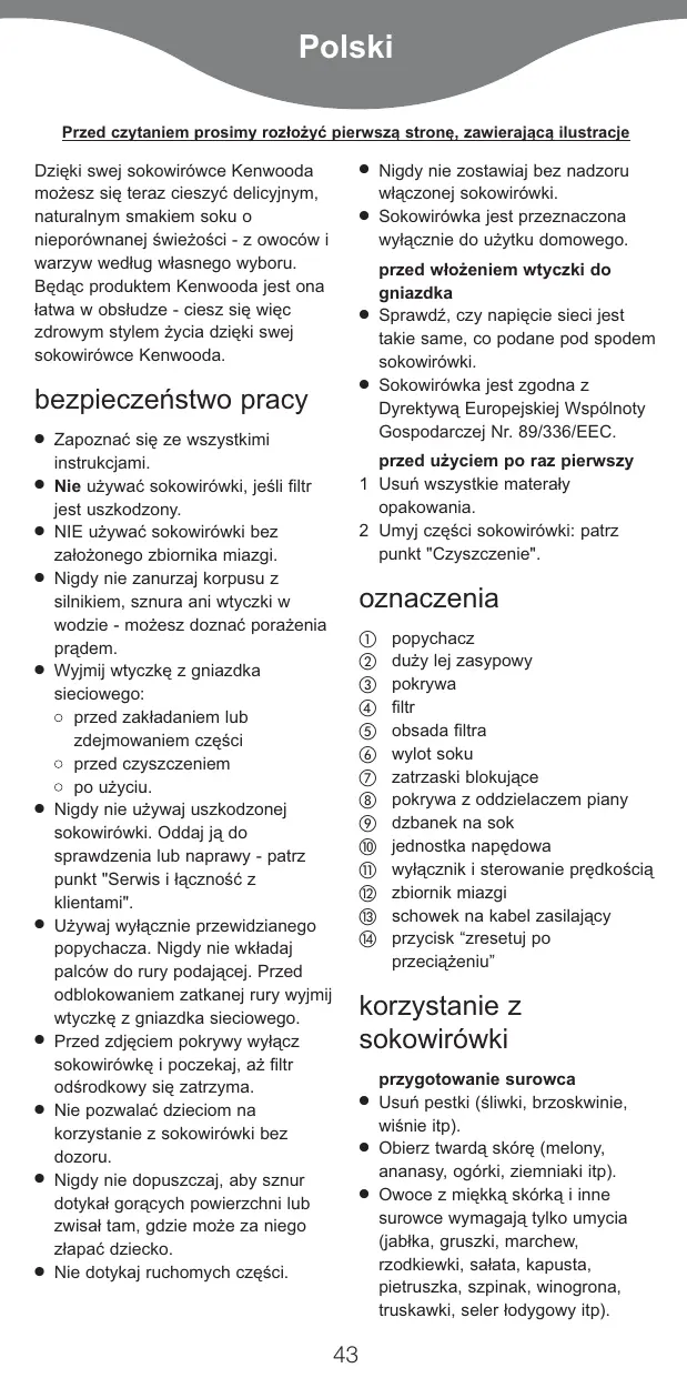 Zapoznać się ze wszystkimi instrukcjami. Nie używać sokowirówki, jeśli filtr jest uszkodzony. NIE używać sokowirówki bez założonego zbiornika miazgi. Nigdy nie zanurzaj korpusu z silnikiem, sznura ani wtyczki w wodzie - mo¯esz doznaç pora¯enia prådem. Wyjmij wtyczkë z gniazdka sieciowego: ● przed zak¢adaniem lub zdejmowaniem czëÿci ● przed czyszczeniem ● po u¯yciu. Nigdy nie u¯ywaj uszkodzonej sokowirówki. Oddaj jå do sprawdzenia lub naprawy - patrz punkt "Serwis i ¢åcznoÿç z klientami". U¯ywaj wy¢åcznie przewidzianego popychacza. Nigdy nie wk¢adaj palców do rury podajåcej. Przed odblokowaniem zatkanej rury wyjmij wtyczkë z gniazdka sieciowego. Przed zdjëciem pokrywy wy¢åcz sokowirówkë i poczekaj, a¯ filtr odÿrodkowy sië zatrzyma. Nie pozwalać dzieciom na korzystanie z sokowirówki bez dozoru. Nigdy nie dopuszczaj, aby sznur dotyka¢ goråcych powierzchni lub zwisa¢ tam, gdzie mo¯e za niego z¢apaç dziecko. Nie dotykaj ruchomych czëÿci.