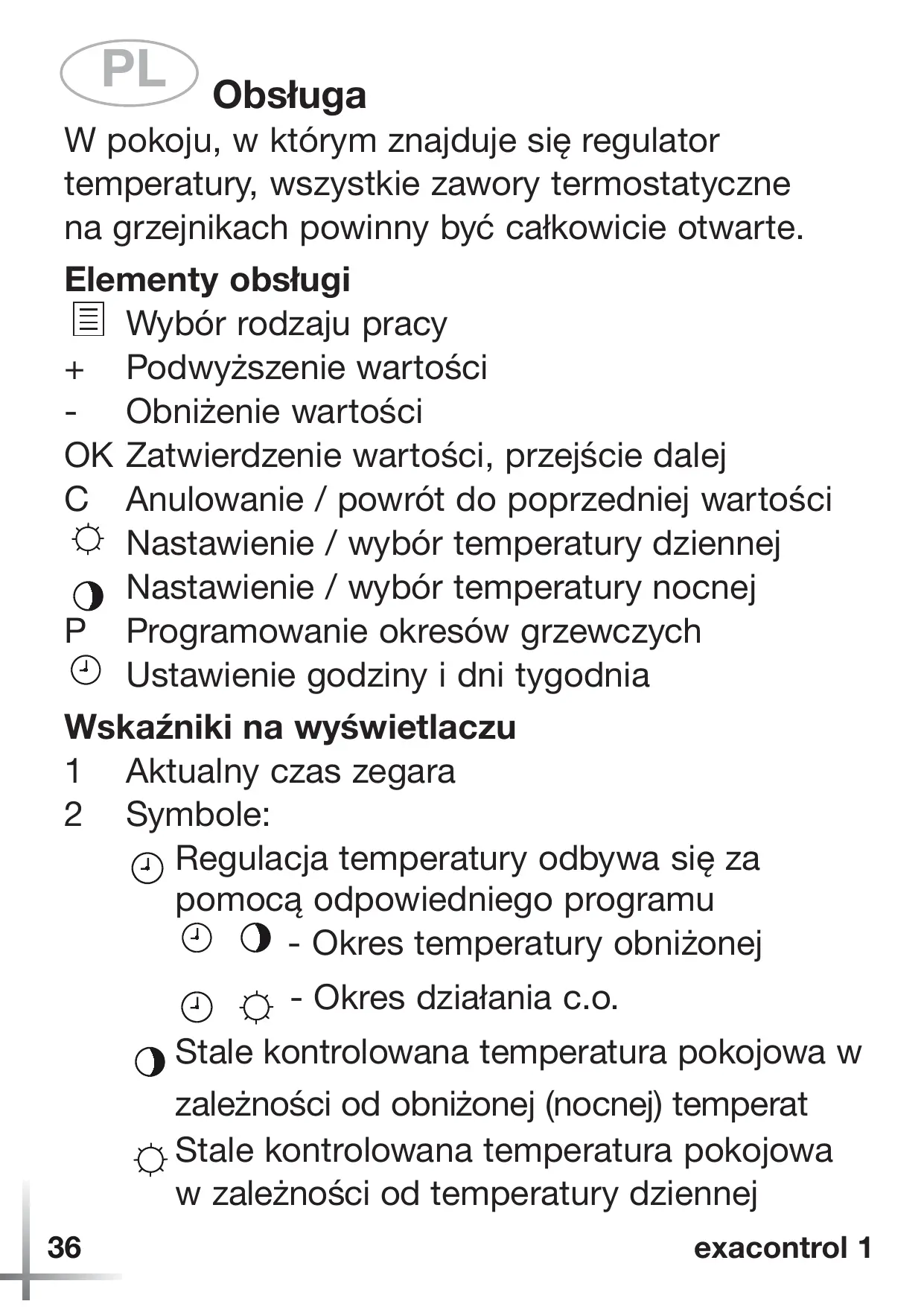 W pokoju, w którym znajduje się regulator temperatury, wszystkie zawory termostatyczne na grzejnikach powinny być całkowicie otwarte. Elementy obsługi Wybór rodzaju pracy + Podwyższenie wartości - Obniżenie wartości OK Zatwierdzenie wartości, przejście dalej C Anulowanie / powrót do poprzedniej wartości Nastawienie / wybór temperatury dziennej Nastawienie / wybór temperatury nocnej P Programowanie okresów grzewczych Ustawienie godziny i dni tygodnia Wskaźniki na wyświetlaczu 1 Aktualny czas zegara 2 Symbole: Regulacja temperatury odbywa się za pomocą odpowiedniego programu - Okres temperatury obniżonej - Okres działania c.o. Stale kontrolowana temperatura pokojowa w zależności od obniżonej (nocnej) temperat Stale kontrolowana temperatura pokojowa w zależności od temperatury dziennej 36