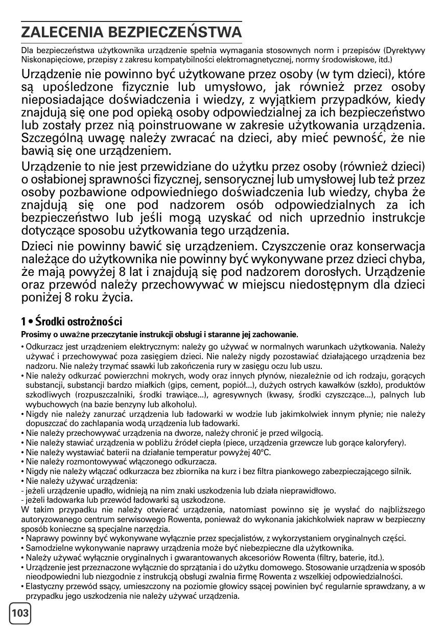 - Urządzenie jest przeznaczone wyłącznie do sprzątania i do użytku domowego. Stosowanie urządzenia w sposób nieodpowiedni lub niezgodnie z instrukcją obsługi zwalnia firmę Rowenta z wszelkiej odpowiedzialności.