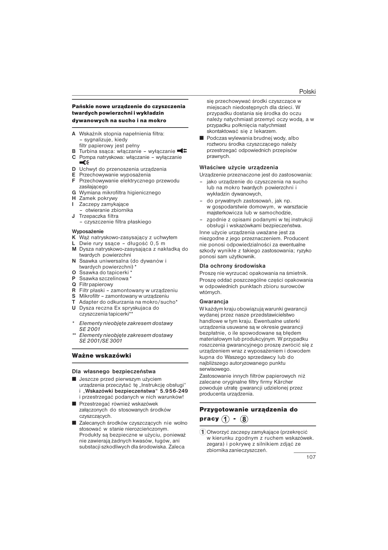 - Elementy nieobjęte zakresem dostawy SE 2001 ** Elementy nieobjęte zakresem dostawy SE 2001/SE 3001 Ważne wskazówki Dla własnego bezpieczeństwa ■ Jeszcze przed pierwszym użyciem urządzenia przeczytać tę „Instrukcję obsługi“ i „Wskazówki bezpieczeństwa“ 5.956-249 i przestrzegać podanych w nich warunków! ■ Przestrzegać również wskazówek załączonych do stosowanych środków czyszczących. ■ Zalecanych środków czyszczących nie wolno stosować w stanie nierozcieńczonym. Produkty są bezpieczne w użyciu, ponieważ nie zawierają żadnych kwasów, ługów, ani substacji szkodliwych dla środowiska. Zaleca się przechowywać środki czyszczące w miejscach niedostępnych dla dzieci. W przypadku dostania się środka do oczu należy natychmiast przemyć oczy wodą, a w przypadku połknięcia natychmiast skontaktować się z lekarzem. ■ Podczas wylewania brudnej wody, albo roztworu środka czyszczącego należy przestrzegać odpowiednich przepisów prawnych. Właściwe użycie urządzenia Urządzenie przeznaczone jest do zastosowania: – jako urządzenie do czyszczenia na sucho lub na mokro twardych powierzchni i wykładzin dywanowych, – do prywatnych zastosowań, jak np. w gospodarstwie domowym, w warsztacie majsterkowicza lub w samochodzie, – zgodnie z opisami podanymi w tej instrukcji obsługi i wskazówkami bezpieczeństwa. Inne użycie urządzenia uważane jest za niezgodne z jego przeznaczeniem. Producent nie ponosi odpowiedzialności za ewentualne szkody wynikłe z takiego zastosowania; ryzyko ponosi sam użytkownik. Dla ochrony środowiska Proszę nie wyrzucać opakowania na śmietnik. Proszę oddać poszczególne części opakowania w odpowiednich punktach zbioru surowców wtórnych. Gwarancja W każdym kraju obowiązują warunki gwarancji wydanej przez nasze przedstawicielstwo handlowe w tym kraju. Ewentualne usterki urządzenia usuwane są w okresie gwarancji bezpłatnie, o ile spowodowane są błędem materiałowym lub produkcyjnym. W przypadku roszczenia gwarancyjnego proszę zwrócić się z urządzeniem wraz z wyposażeniem i dowodem kupna do Waszego sprzedawcy lub do najbliższego autoryzowanego punktu serwisowego. Zastosowanie innych filtrów papierowych niż zalecane oryginalne filtry firmy Kärcher powoduje utratę gwarancji udzielonej przez producenta urządzenia. Przygotowanie urządzenia do pracy Otworzyć zaczepy zamykające (przekręcić w kierunku zgodnym z ruchem wskazówek. zegara) i pokrywę z silnikiem zdjąć ze zbiornika zanieczyszczeń.