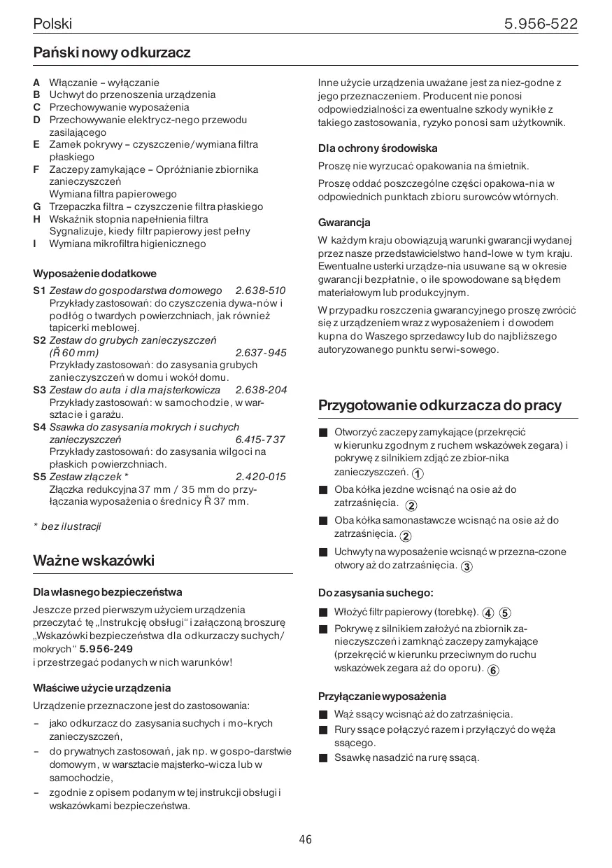 S1 Kit domestique S3 Kit pour la voiture et le bricolage 2.638-204 Exemples d’utilisation: dans la voiture, à l’atelier et au garage. S4 Buse à aspirer les déchets mouillés et secs 6.415-737 Exemples d’utilisation: pour aspirer les déchets mouillés sur surfaces planes. S5 Adaptateur en kit * 2.420-015 Réducteur de 37 à 35 mm de diamètre, a utiliser sur les accessoires à orifice de 37 mm de diamètre
