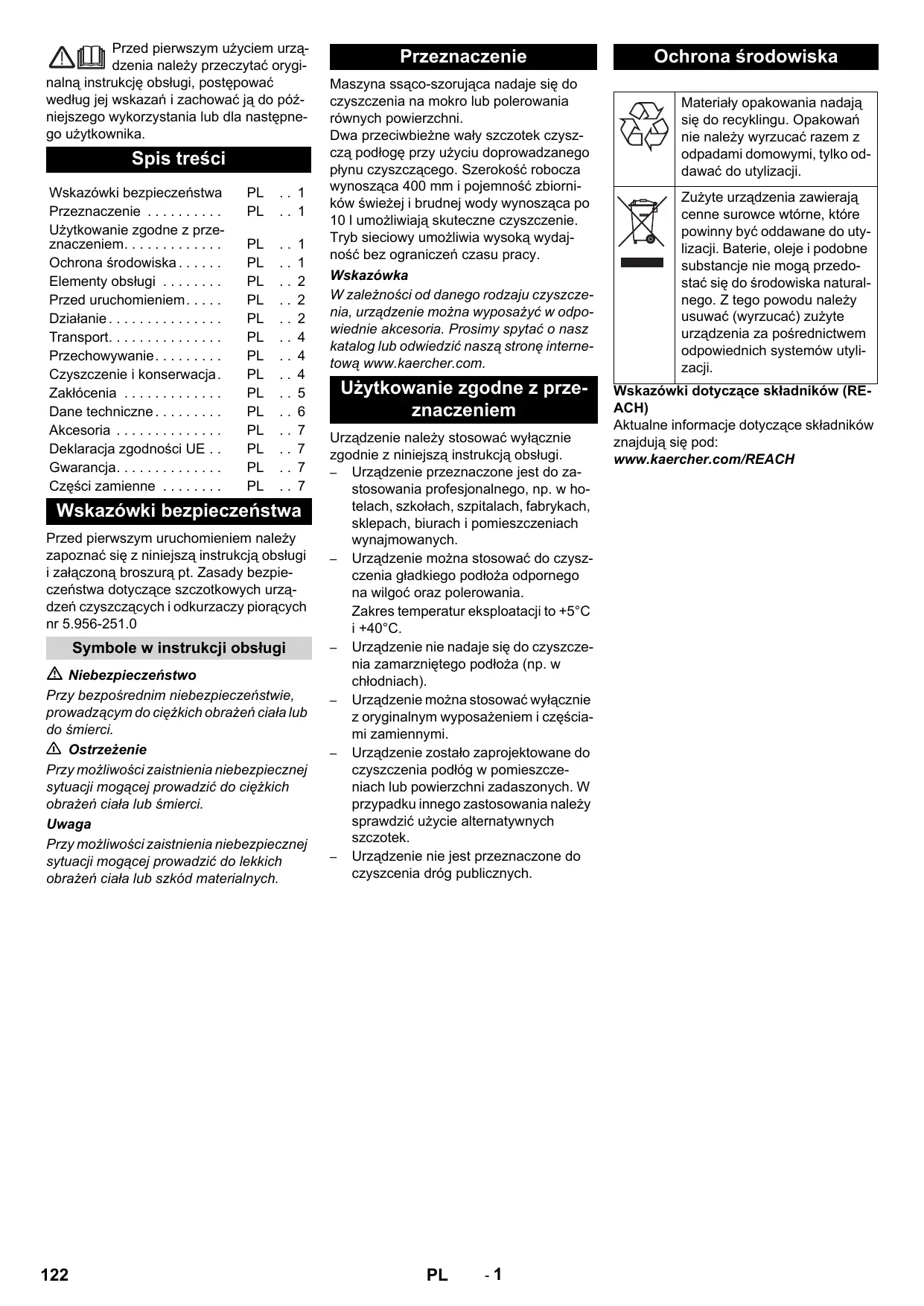 Przeznaczenie Maszyna ssąco-szorująca nadaje się do czyszczenia na mokro lub polerowania równych powierzchni. Dwa przeciwbieżne wały szczotek czyszczą podłogę przy użyciu doprowadzanego płynu czyszczącego. Szerokość robocza wynosząca 400 mm i pojemność zbiorników świeżej i brudnej wody wynosząca po 10 l umożliwiają skuteczne czyszczenie. Tryb sieciowy umożliwia wysoką wydajność bez ograniczeń czasu pracy. Wskazówka W zależności od danego rodzaju czyszczenia, urządzenie można wyposażyć w odpowiednie akcesoria. Prosimy spytać o nasz katalog lub odwiedzić naszą stronę internetową www.kaercher.com. Użytkowanie zgodne z przeznaczeniem Urządzenie należy stosować wyłącznie zgodnie z niniejszą instrukcją obsługi. – Urządzenie przeznaczone jest do zastosowania profesjonalnego, np. w hotelach, szkołach, szpitalach, fabrykach, sklepach, biurach i pomieszczeniach wynajmowanych. – Urządzenie można stosować do czyszczenia gładkiego podłoża odpornego na wilgoć oraz polerowania. Zakres temperatur eksploatacji to +5°C i +40°C. – Urządzenie nie nadaje się do czyszczenia zamarzniętego podłoża (np. w chłodniach). – Urządzenie można stosować wyłącznie z oryginalnym wyposażeniem i częściami zamiennymi. – Urządzenie zostało zaprojektowane do czyszczenia podłóg w pomieszczeniach lub powierzchni zadaszonych. W przypadku innego zastosowania należy sprawdzić użycie alternatywnych szczotek. – Urządzenie nie jest przeznaczone do czyszcenia dróg publicznych.