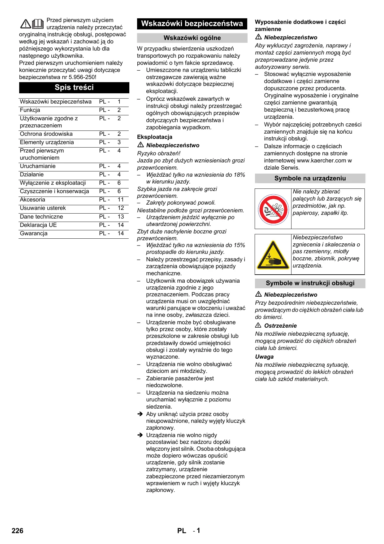 Wskazówki bezpieczeństwa Wskazówki ogólne W przypadku stwierdzenia uszkodzeń transportowych po rozpakowaniu należy powiadomić o tym fakcie sprzedawcę. – Umieszczone na urządzeniu tabliczki ostrzegawcze zawierają ważne wskazówki dotyczące bezpiecznej eksploatacji. – Oprócz wskazówek zawartych w instrukcji obsługi należy przestrzegać ogólnych obowiązujących przepisów dotyczących bezpieczeństwa i zapobiegania wypadkom. Eksploatacja Niebezpieczeństwo Ryzyko obrażeń! Jazda po zbyt dużych wzniesieniach grozi przewróceniem. – Wjeżdżać tylko na wzniesienia do 18% w kierunku jazdy. Szybka jazda na zakręcie grozi przewróceniem. – Zakręty pokonywać powoli. Niestabilne podłoże grozi przewróceniem. – Urządzeniem jeździć wyłącznie po utwardzonej powierzchni. Zbyt duże nachylenie boczne grozi przewróceniem. – Wjeżdżać tylko na wzniesienia do 15% prostopadle do kierunku jazdy. – Należy przestrzegać przepisy, zasady i zarządzenia obowiązujące pojazdy mechaniczne. – Użytkownik ma obowiązek używania urządzenia zgodnie z jego przeznaczeniem. Podczas pracy urządzenia musi on uwzględniać warunki panujące w otoczeniu i uważać na inne osoby, zwłaszcza dzieci. – Urządzenie może być obsługiwane tylko przez osoby, które zostały przeszkolone w zakresie obsługi lub przedstawiły dowód umiejętności obsługi i zostały wyraźnie do tego wyznaczone. – Urządzenia nie wolno obsługiwać dzieciom ani młodzieży. – Zabieranie pasażerów jest niedozwolone. – Urządzenia na siedzeniu można uruchamiać wyłącznie z poziomu siedzenia. Î Aby uniknąć użycia przez osoby nieupoważnione, należy wyjęty kluczyk zapłonowy. Î Urządzenia nie wolno nigdy pozostawiać bez nadzoru dopóki włączony jest silnik. Osoba obsługująca może dopiero wówczas opuścić urządzenie, gdy silnik zostanie zatrzymany, urządzenie zabezpieczone przed niezamierzonym wprawieniem w ruch i wyjęty kluczyk zapłonowy. PL - 1 Wyposażenie dodatkowe i części zamienne Niebezpieczeństwo Aby wykluczyć zagrożenia, naprawy i montaż części zamiennych mogą być przeprowadzane jedynie przez autoryzowany serwis. – Stosować wyłącznie wyposażenie dodatkowe i części zamienne dopuszczone przez producenta. Oryginalne wyposażenie i oryginalne części zamienne gwarantują bezpieczną i bezusterkową pracę urządzenia. – Wybór najczęściej potrzebnych cześci zamiennych znajduje się na końcu instrukcji obsługi. – Dalsze informacje o częściach zamiennych dostępne na stronie internetowej www.kaercher.com w dziale Serwis. Symbole na urządzeniu Nie należy zbierać palących lub żarzących się przedmiotów, jak np. papierosy, zapałki itp. Niebezpieczeństwo zgniecenia i skaleczenia o pas rzemienny, miotły boczne, zbiornik, pokrywę urządzenia. Symbole w instrukcji obsługi Niebezpieczeństwo Przy bezpośrednim niebezpieczeństwie, prowadzącym do ciężkich obrażeń ciała lub do śmierci. 몇 Ostrzeżenie Na możliwie niebezpieczną sytuację, mogącą prowadzić do ciężkich obrażeń ciała lub śmierci. Uwaga Na możliwie niebezpieczną sytuację, mogącą prowadzić do lekkich obrażeń ciała lub szkód materialnych. Funkcja Zamiatarka pracuje na zasadzie przerzucania. – Miotły boczne (3) czyszczą narożniki i krawędzie zamiatanej powierzchni i kierują zanieczyszczenia w stronę walca zamiatającego. – Obracający się walec zamiatający (4) odprowadza zanieczyszczenia bezpośrednio do zbiornika śmieci (5). – Pył znajdujący się w zbiorniku jest zatrzymywany przez filtr pyłu (2), a przefiltrowane i oczyszczone powietrze jest odsysane przez dmuchawę ssącą (1). Użytkowanie zgodne z przeznaczeniem Zamiatarkę należy stosować wyłącznie zgodnie z niniejszą instrukcją obsługi. Î Przed rozpoczęciem pracy należy sprawdzić urządzenie z wyposażeniem roboczym pod kątem prawidłowego stanu i bezpieczeństwa eksploatacji. Jeżeli nie jest on poprawny, to sprzętu takiego nie wolno używać. – Zamiatarka jest przeznaczona do zamiatania zanieczyszczonych powierzchni wewnętrznych i zewnętrznych. – Urządzenie nie jest dopuszczone do otwartego ruchu drogowego. – Urządzenie nie jest przystosowane do odsysania pyłów szkodliwych dla zdrowia. – Nie należy dokonywać żadnych modyfikacji urządzenia. – Nigdy nie zamiatać i nie zasysać cieczy wybuchowych, gazów palnych ani nierozcieńczonych kwasów lub rozpuszczalników! Zaliczają się do nich benzyna, rozcieńczalniki do farb lub olej opałowy, które w wyniku zmieszania z zasysanym powietrzem mogą tworzyć opary lub mieszanki wybuchowe, ponadto aceton, nierozcieńczone kwasy i rozpuszczalniki, mogące zniszczyć materiały, z których wykonane jest urządzenie. – Nie zamiatać i nie zasysać płonących ani żarzących się przedmiotów. – Urządzenie jest przeznaczone wyłącznie do zastosowania w celach wymienionych w instrukcji obsługi. – Urządzenie może pracować wyłącznie na powierzchniach wskazanych przez właściciela lub jego pełnomocnika. – Przebywanie w obszarze zagrożenia jest zabronione. Eksploatacja urządzenia w pomieszczeniach zagrożonych wybuchem jest zabroniona. – Zasadniczo obowiązuje zasada: nie przechowywać łatwo zapalnych materiałów w pobliżu urządzenia (niebezpieczeństwo wybuchu/pożaru). Ochrona środowiska Materiał, z którego wykonano opakowanie nadaje się do powtórnego przetworzenia. Prosimy nie wyrzucać opakowania do śmieci z gospodarstw domowych, lecz oddać do recyklingu. Zużyte urządzenia zawierają cenne surowce wtórne, które powinny być oddawane do utylizacji. Akumulatory, olej i tym podobne substancje nie powinny przedostać się do środowiska naturalnego. Prosimy o utylizację starych urządzeń w odpowiednich placówkach zbierających surowce wtórne. Wskazówki dotyczące składników (REACH) Aktualne informacje dotyczące składników znajdują się pod: http://www.