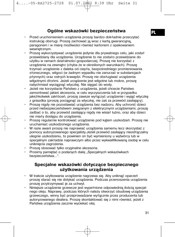 PL Przed uruchomieniem urządzenia proszę bardzo dokładnie przeczytać instrukcję obsługi. Proszę zachować ją wraz z kartą gwarancyjną, paragonem i w miarę możliwości również kartonem z opakowaniem wewnętrznym. Proszę wykorzystywać urządzenie jedynie dla prywatnego celu, jaki został przewidziany dla urządzenia. Urządzenie to nie zostało przewidziane do użytku w ramach działalności gospodarczej. Proszę nie korzystać z urządzenia na zewnątrz (chyba że w określonych warunkach). Proszę trzymać urządzenie z daleka od ciepła, bezpośredniego promieniowania słonecznego, wilgoci (w żadnym wypadku nie zanurzać w substancjach płynnych) oraz ostrych krawędzi. Proszę nie obsługiwać urządzenia wilgotnymi dłońmi. Jeżeli urządzenie jest wilgotne lub mokre, proszę natychmiast wyciągnąć wtyczkę. Nie sięgać do wody. Jeżeli nie korzystacie Państwo z urządzenia, jeżeli chcecie Państwo zamontować jakieś akcesoria, w celu wyczyszczenia lub w przypadku jakichkolwiek zakłóceń, proszę zawsze wyłączyć urządzenie i wyjąć wtyczkę z gniazdka (proszę pociągnąć za wtyczkę, nie zaś za przewód zasilający). Proszę nigdy nie pozostawiać urządzenia bez nadzoru. Aby uchronić dzieci przed niebezpieczeństwem związanym z elektrycznymi urządzeniami, proszę zadbać o to, aby przewód zasilający nigdy nie wisiał luźno, oraz aby dzieci nie miały dostępu do urządzenia. Proszę regularnie kontrolować urządzenie pod kątem uszkodzeń. Proszę nie uruchamiać uszkodzonego urządzenia. W razie awarii proszę nie naprawiać urządzenia samemu lecz skorzystać z pomocy autoryzowanego specjalisty.Jeżeli przewód zasilający nieodłączalny ulegnie uszkodzeniu, to powinien on być wymieniony u wytwórcy lub w specjalnym zakładzie naprawczym albo przez wykwalifikowaną osobę w celu uniknięcia zagrożenia. Proszę stosować tylko oryginalne akcesoria. Prosimy pamiętać o podanych dalej „Specjalnych wskazówkach bezpieczeństwa...“.